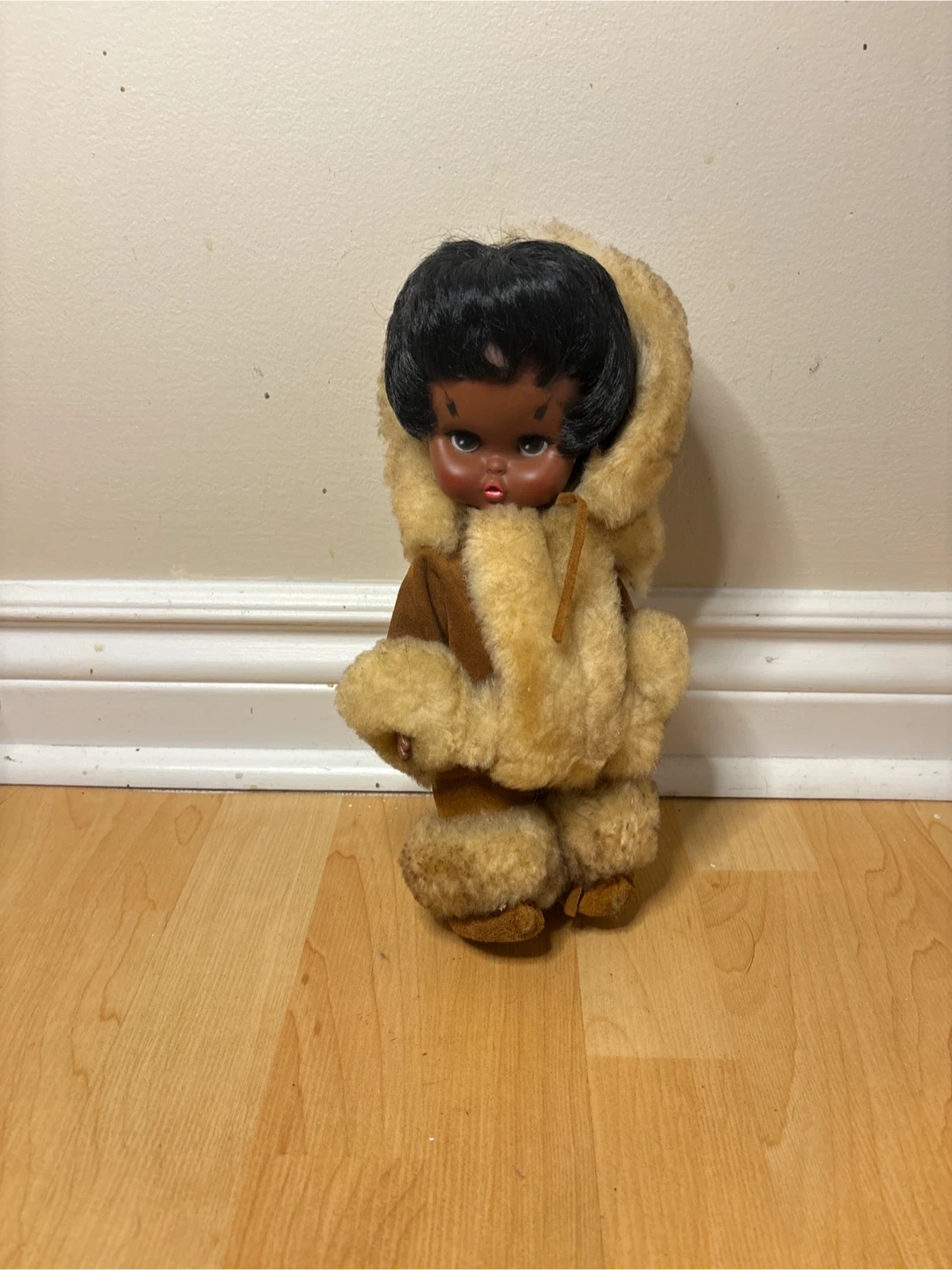 The coat is made from genuine suede with shearling trim, not faux, and showcases classic Arctic/Inuit-inspired styling typical of the era. There is light age-appropriate wear to the hood fur, consistent with vintage pieces of this age, but overall she presents very well and has strong display appeal.