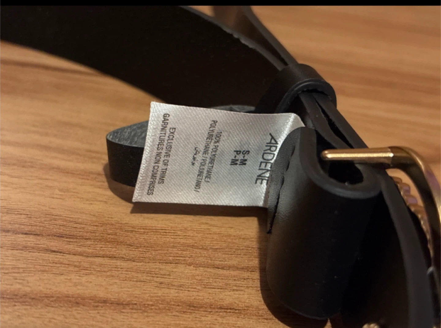 Add a touch of elegance to any outfit with this new Ardenes black belt, featuring a stylish gold buckle and original tags. This versatile accessory is perfect for cinching dresses, skirts, or pants, and its sleek design makes it a timeless addition to your wardrobe.