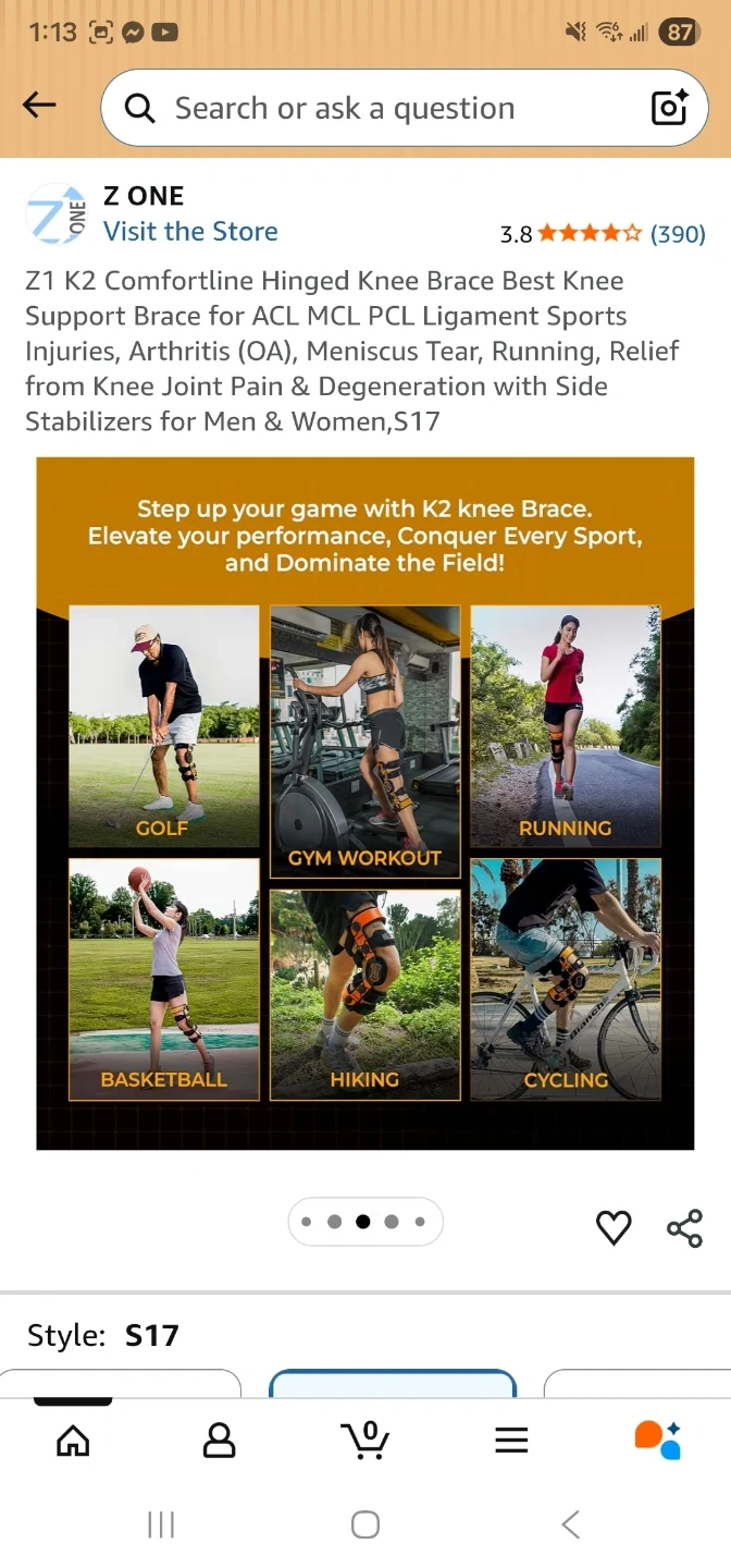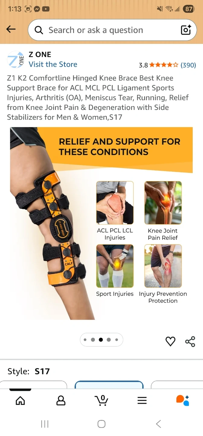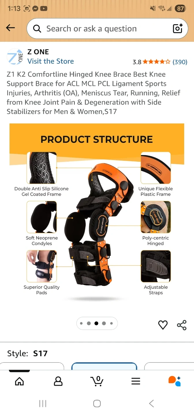 This is a Z One K2 Comfortline hinged knee brace. It's designed for ACL, MCL, and PCL ligament support. Features include double anti-slip silicone gel coated frames and soft neoprene condyles.