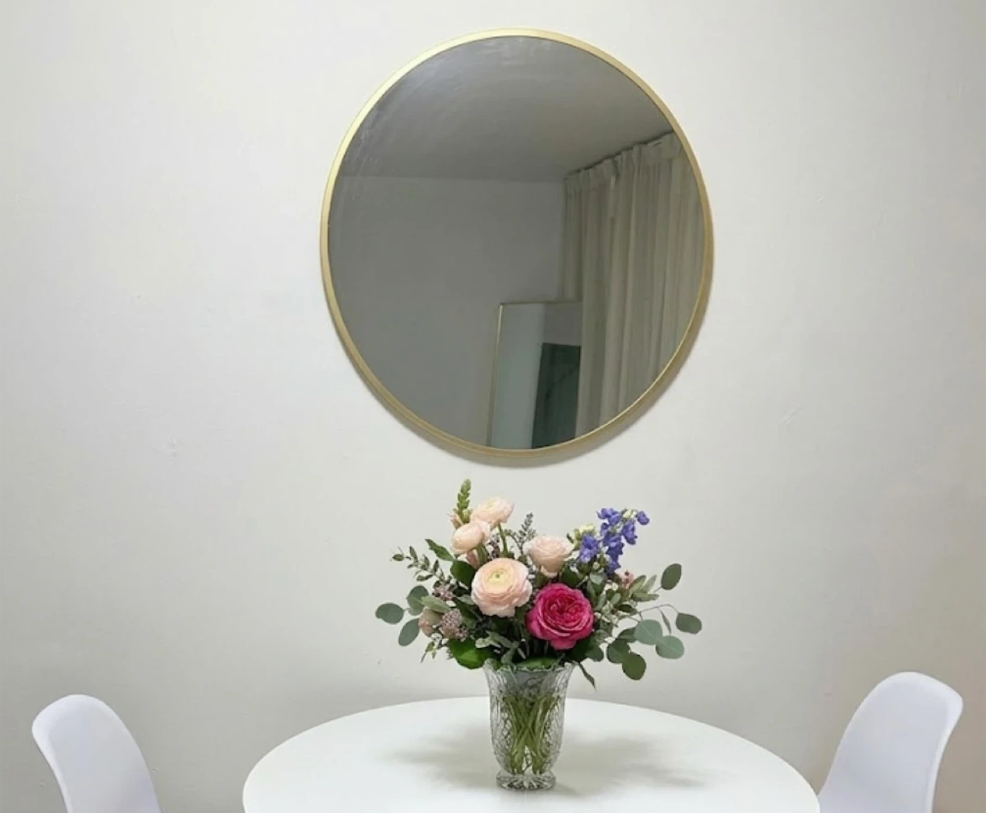 A stylish round mirror with a thin gold frame. It's perfect for adding a touch of elegance to any room. The reflective surface is clear and bright.