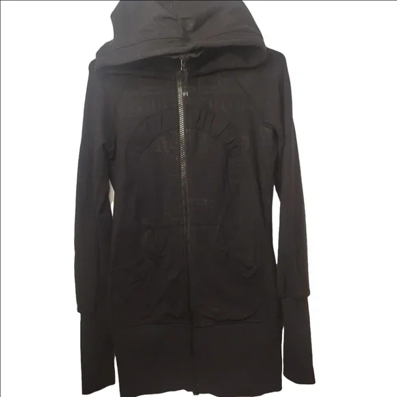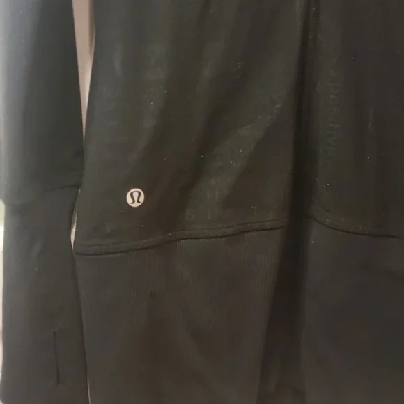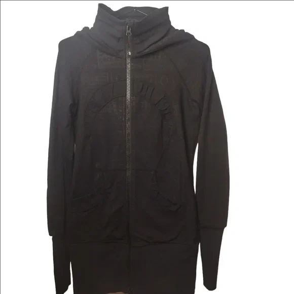 Selling a Lululemon black hoodie in size 4. It's in great condition and perfect for workouts or just lounging around. The hoodie features a full zip and thumbholes, making it extra cozy!