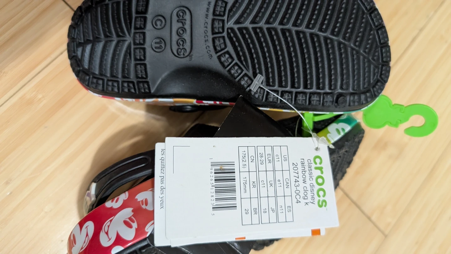 Crocs Classic Disney rainbow clogs for kids. Features Mickey Mouse graphics and glittery Jibbitz. Size is US 11, equivalent to EUR 29. Comes with original tags.