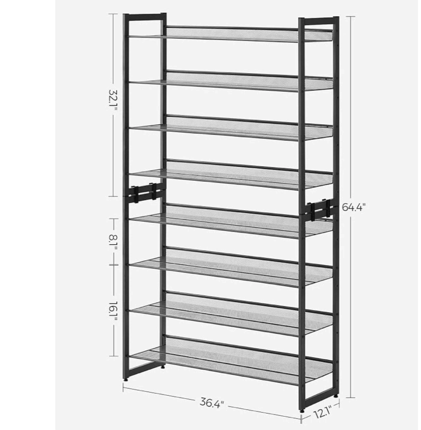 This is a 10-tier metal mesh shoe rack organizer. It's constructed with a durable black metal frame and mesh shelves. Each shelf supports up to 20 lbs. This rack is perfect for storing shoes, boots, or other accessories in your closet or entryway.