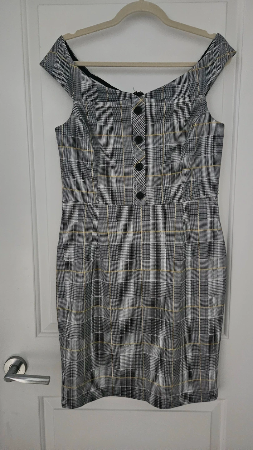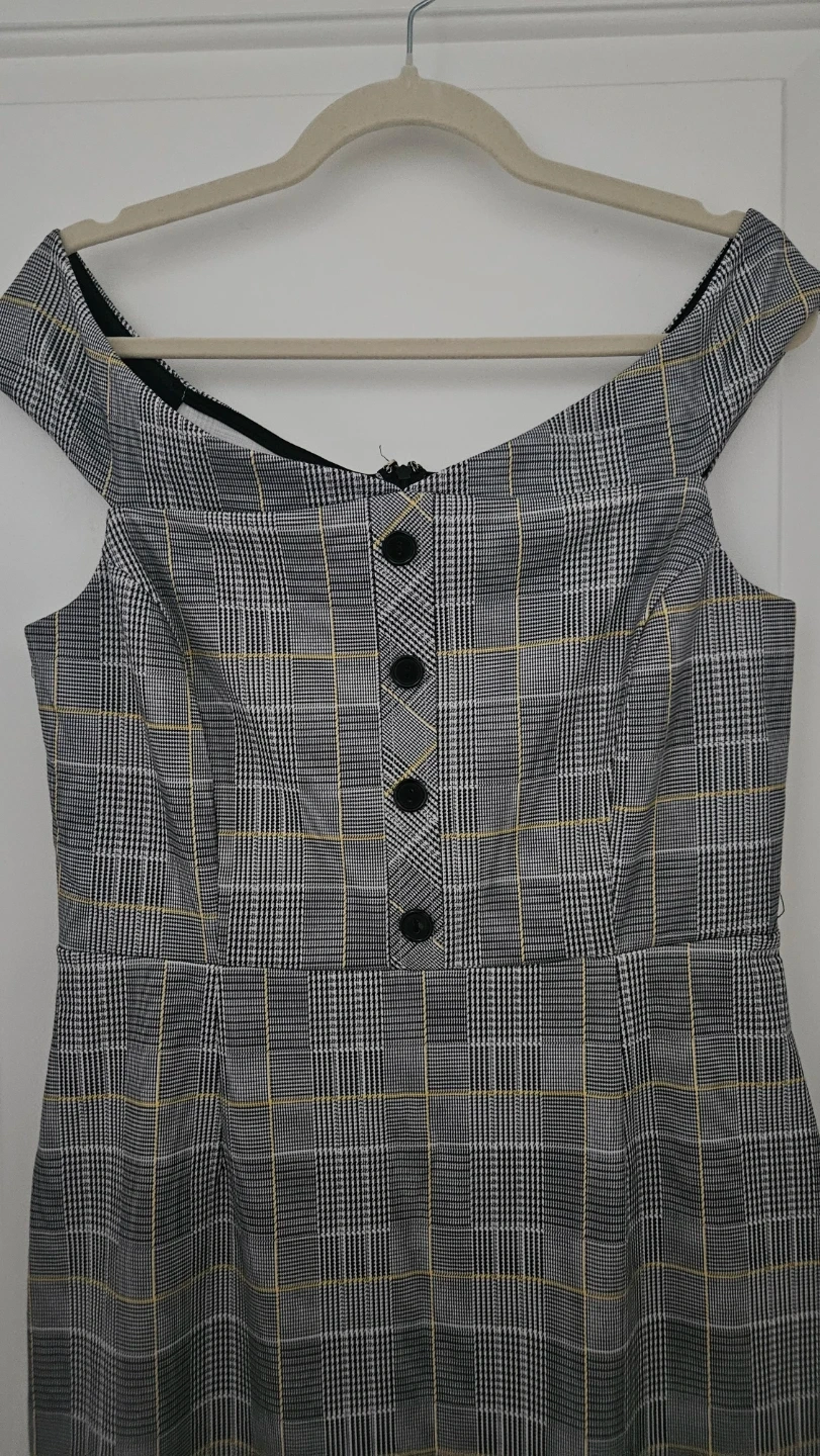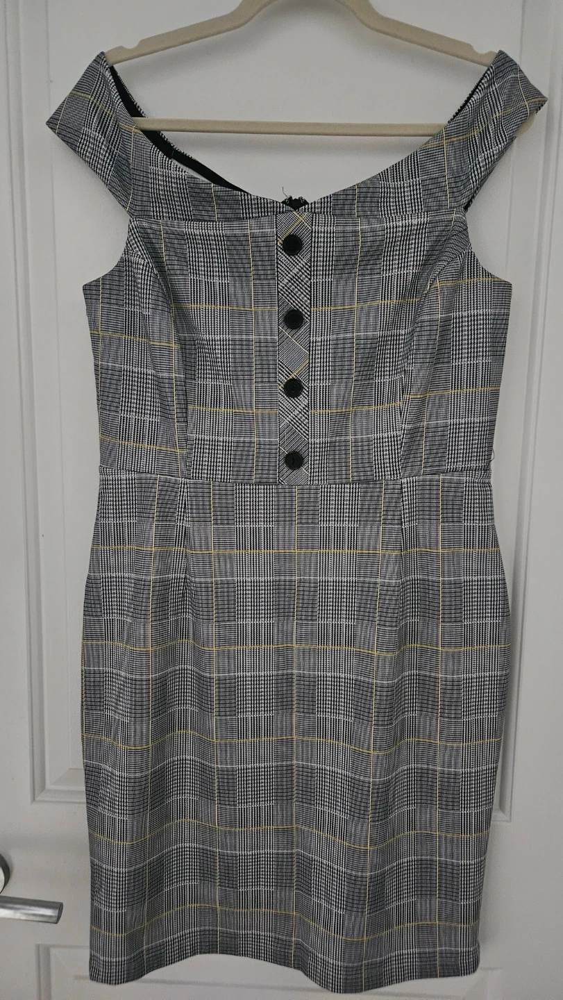 Selling a RICKI'S off-the-shoulder dress in a size 10. It features a classic plaid pattern with black, white, and yellow accents. The dress has button details down the front and a zippered back closure. It's a great option for a casual outing or a more dressed-up event!