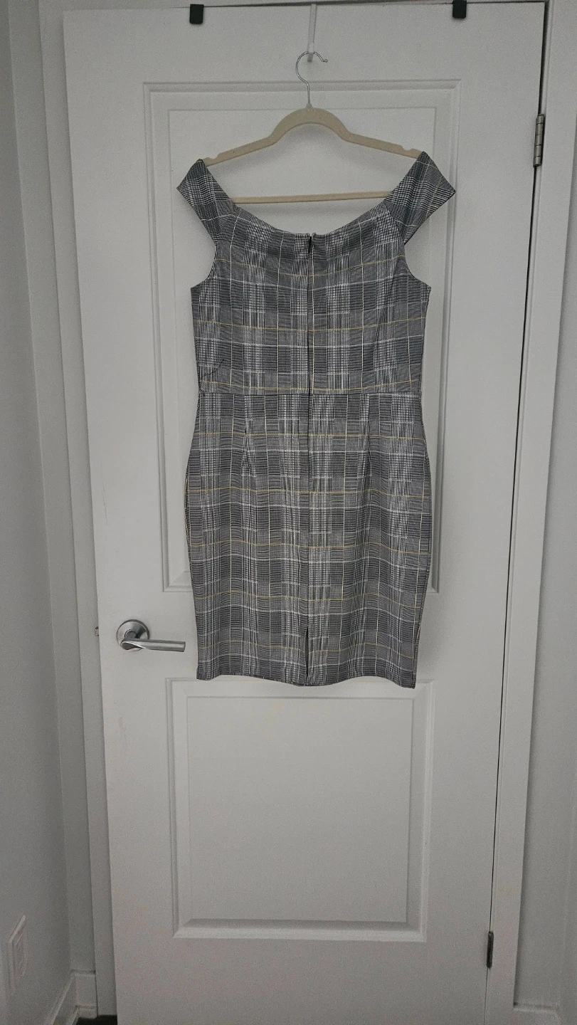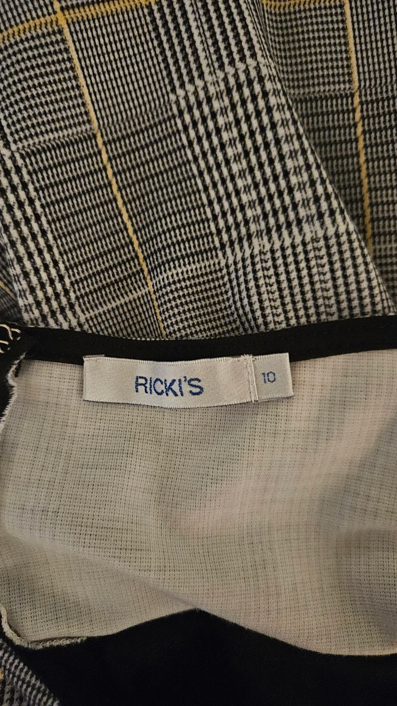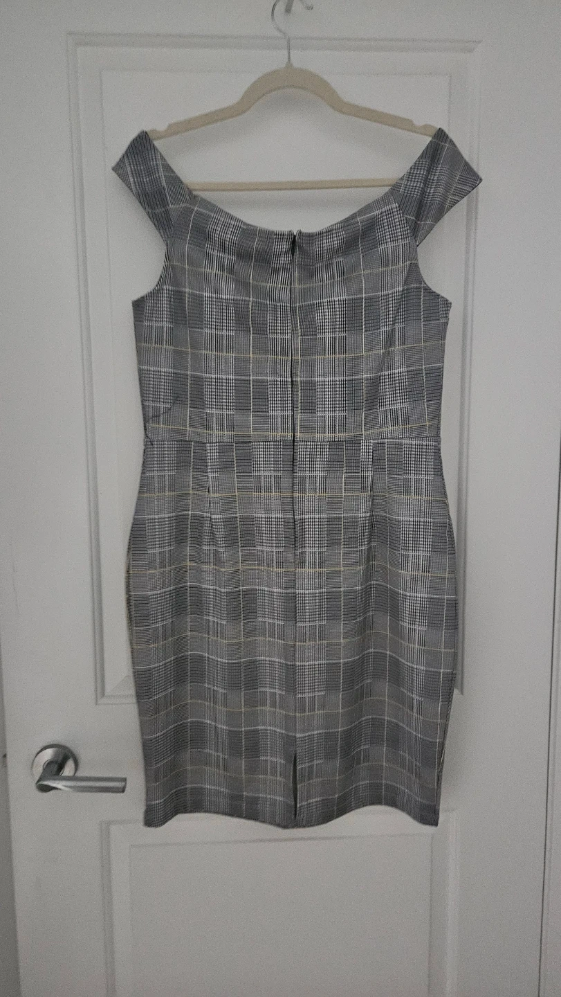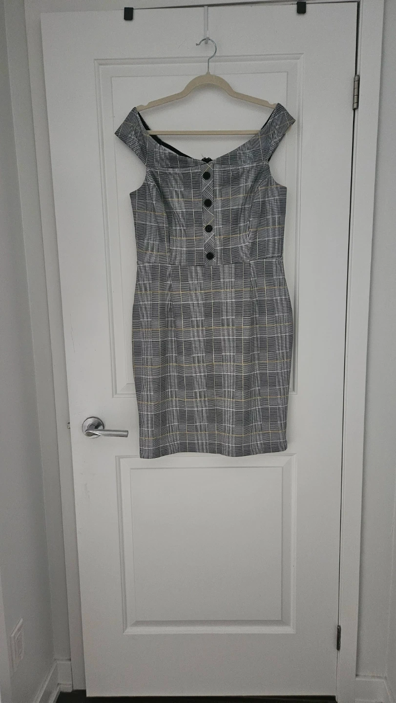 Selling a RICKI'S off-the-shoulder dress in a size 10. It features a classic plaid pattern with black, white, and yellow accents. The dress has button details down the front and a zippered back closure. It's a great option for a casual outing or a more dressed-up event!