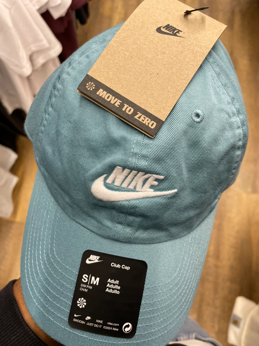 Nike Club Cap in a light blue colour. It's a size S/M for adults. Made with cotton. Features the classic Nike Swoosh logo.