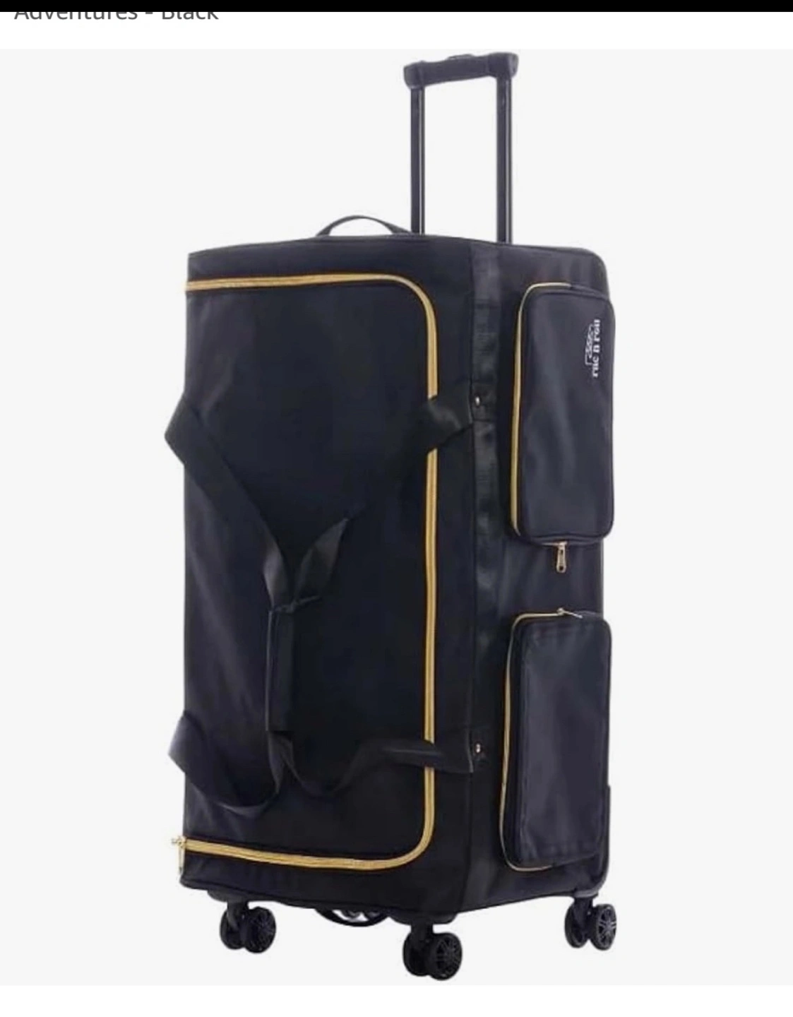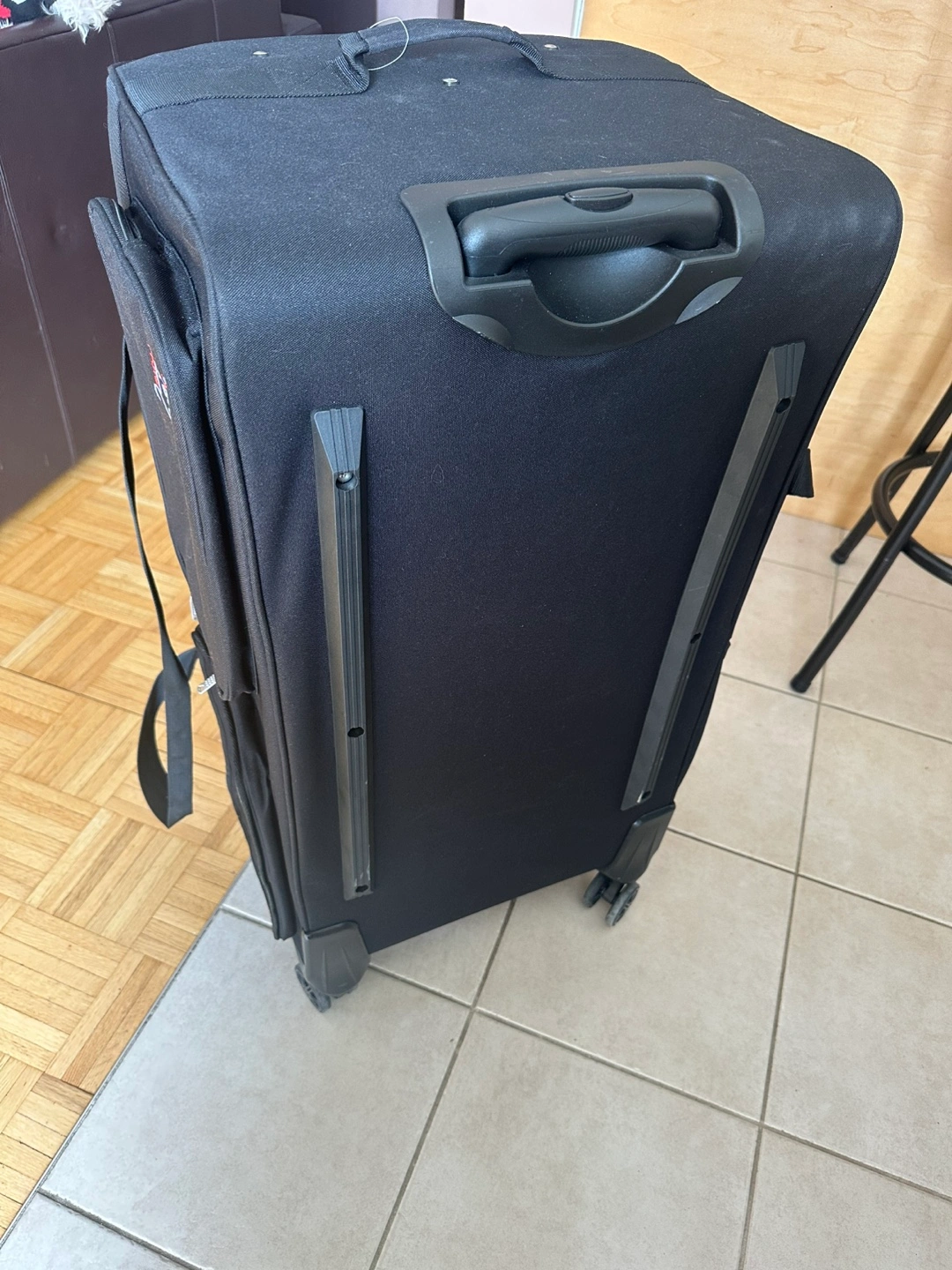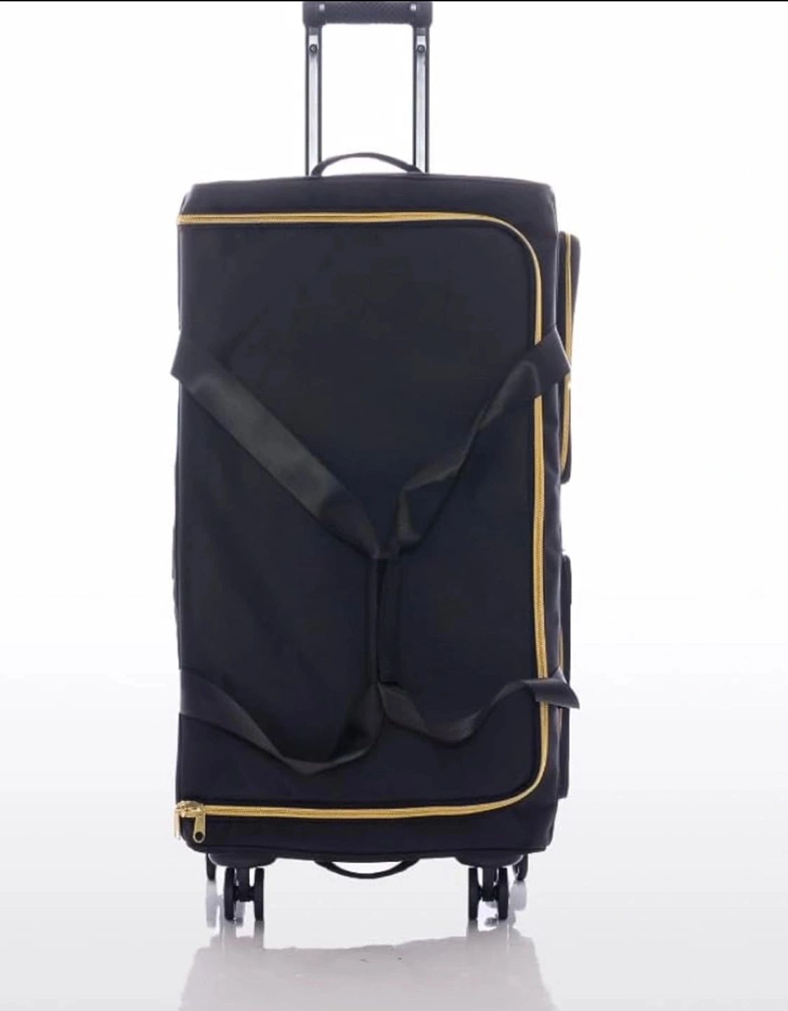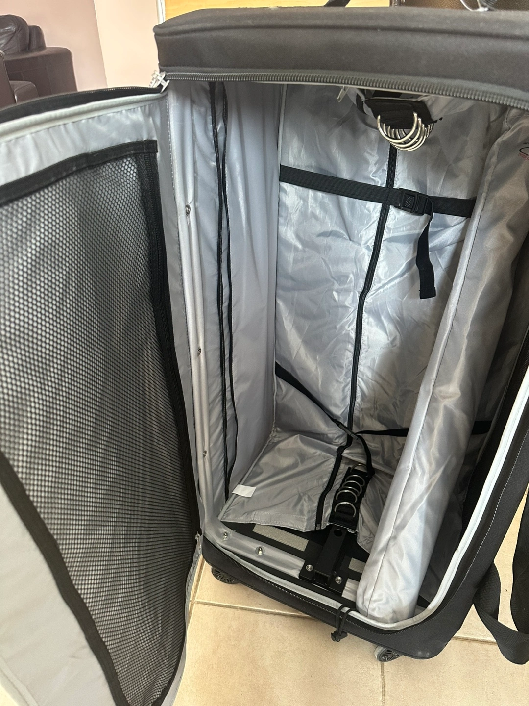 Black rolling garment bag. Features multiple compartments and a retractable clothing rack. Excellent for travel. Durable construction. Wheels included.