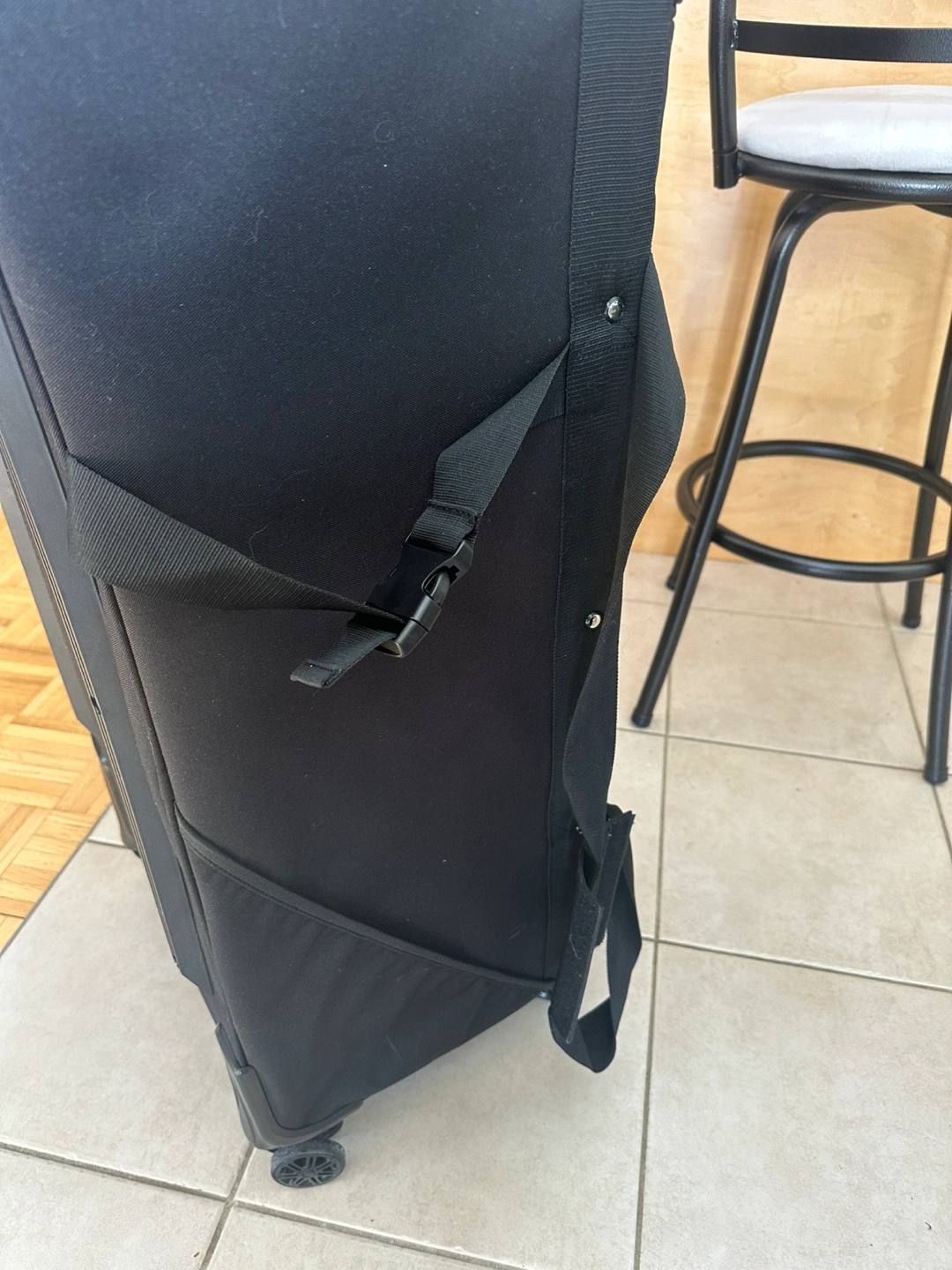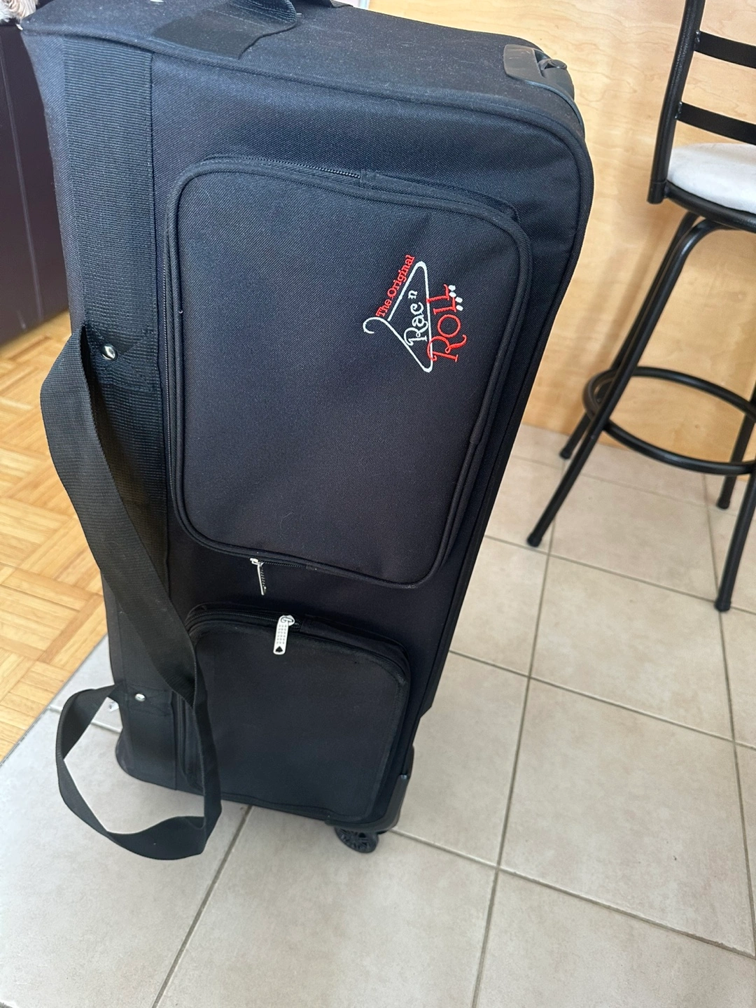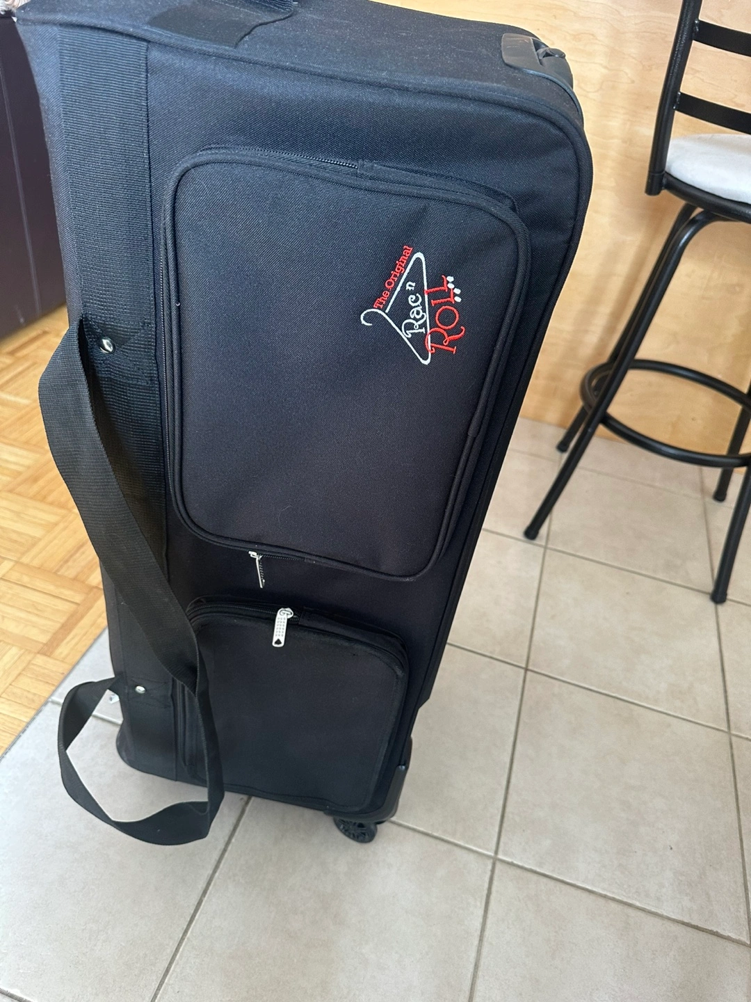 Black rolling Rack n Roll luggage. The bag has multiple pockets, including one large zippered pocket that folds flat to act as a garment bag. Rolling rack poles easily fit it making it easy for a dancer to access their outfits. Brand new in mint condition. Bought before Covid then my daughter quit and it was never used. Original price $450