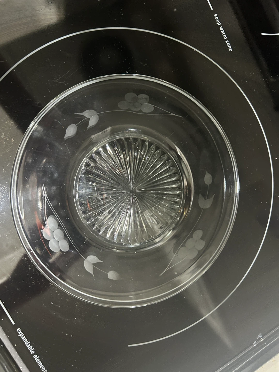 Lovely clear glass plates featuring an etched floral pattern.