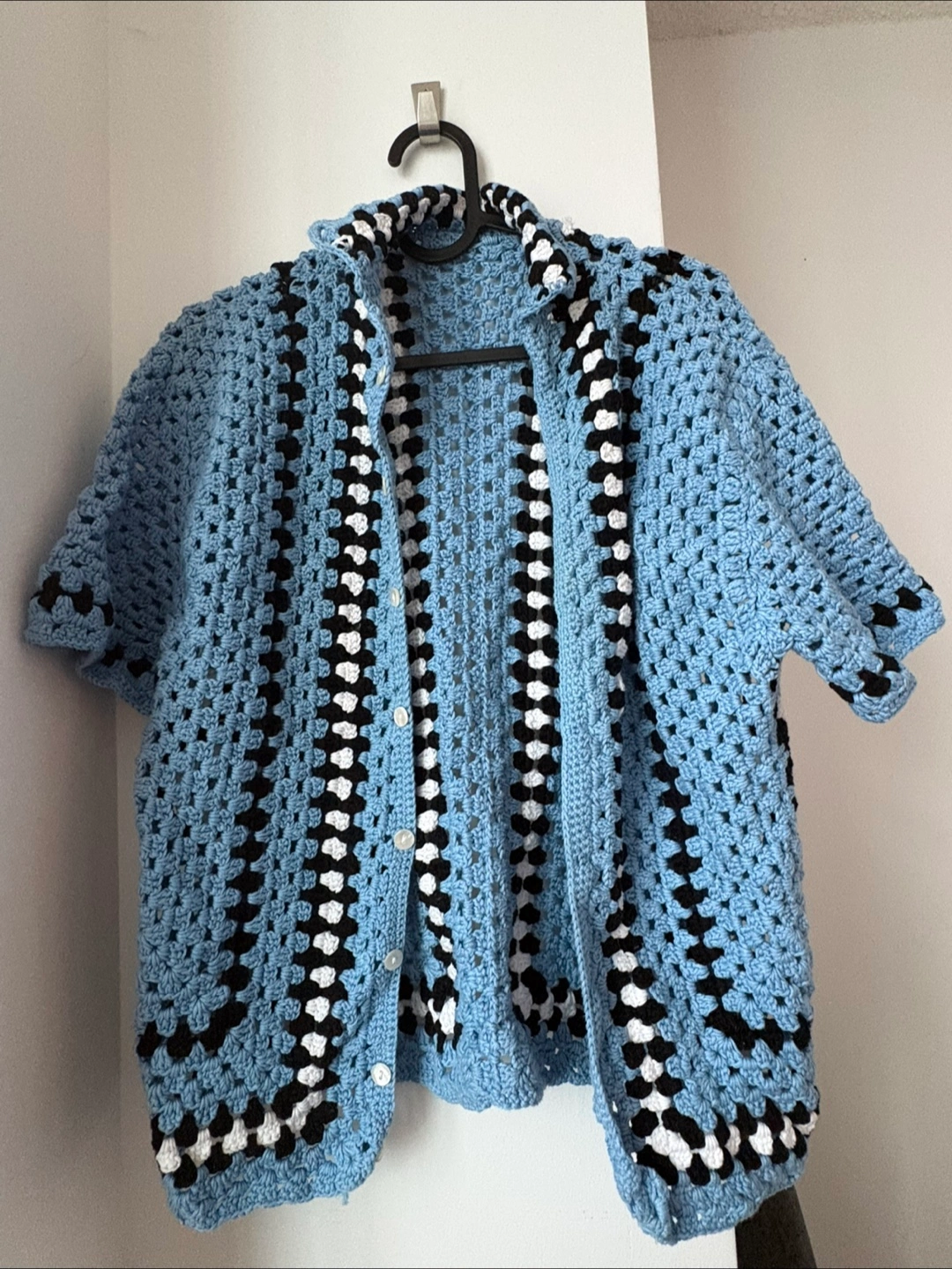 A light blue, short-sleeved crochet button-up shirt with black and white stripe accents. It's hand-knitted with a granny square pattern. This unique piece is great for adding a pop of colour and texture to an outfit.