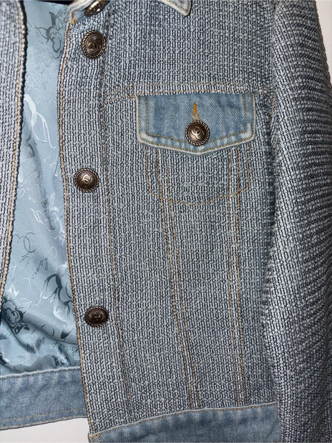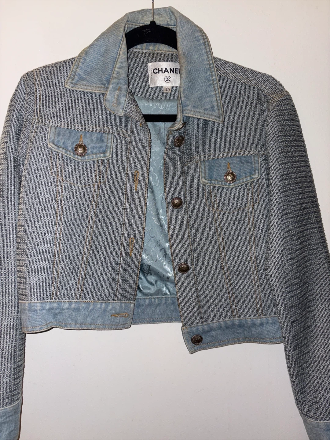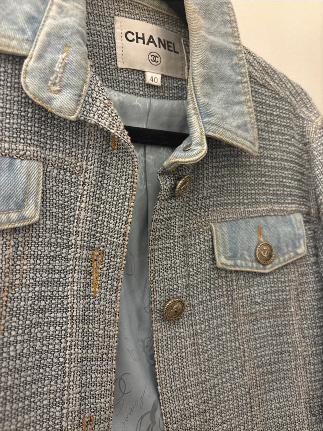 A stylish Chanel jacket combining denim and tweed elements. It features a light blue satin lining with a delicate floral pattern. The size is 40, perfect for a fashionable statement.