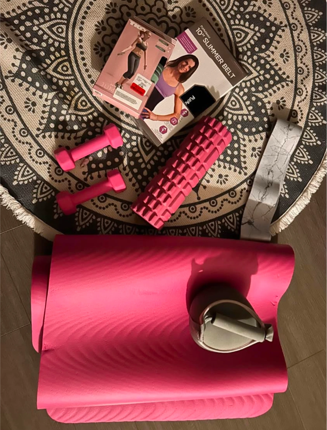 Workout bundle includes a pink yoga mat, two pink dumbbells, a pink foam roller, a grey kettlebell, and a resistance band. Also included is a Purolator 10" slimmer belt. Great for home workouts.