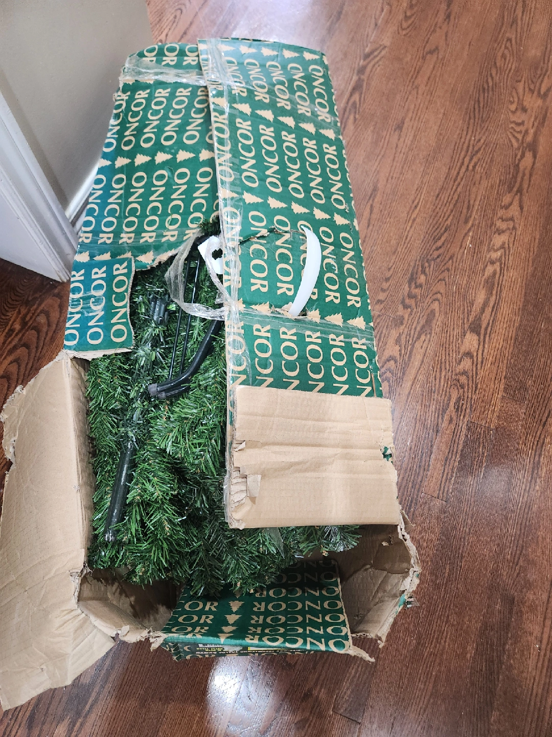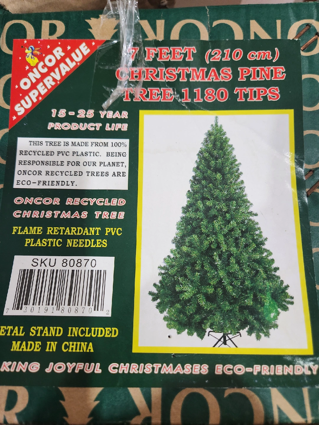 Selling an Oncor Supervalue 7-foot Christmas Pine Tree! It has 1180 tips for a full and festive look. The tree is made from 100% recycled PVC plastic, making it an eco-friendly choice. It also features flame-retardant PVC plastic needles and includes a metal stand. Get ready for joyful Christmases!