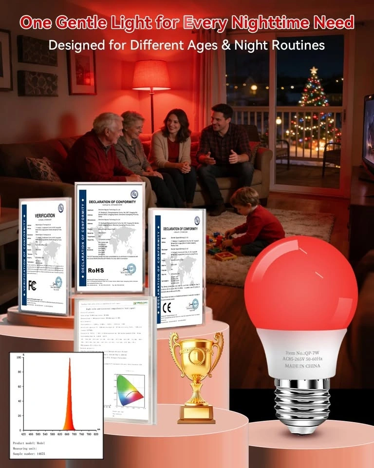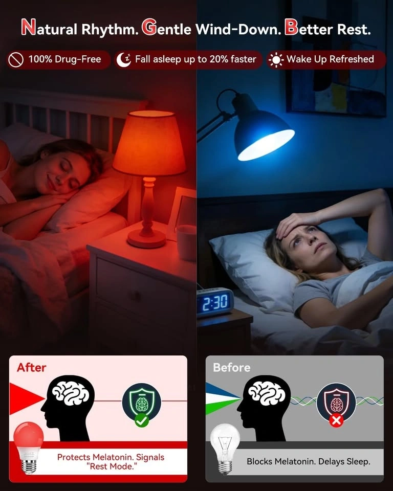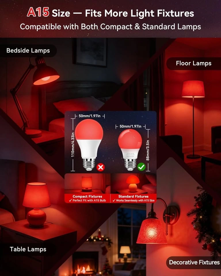 Awesome red light bulb for better sleep. This 670nm red light bulb blocks 100% blue light, super gentle on your eyes for all-night use. Helps with natural melatonin production so you can fall asleep faster and wake up refreshed. It's 7W and 700 lumens, bright enough for reading but still gentle before bed. Has an A15 size so it fits lots of lamps like bedside, floor, table, and decorative fixtures.