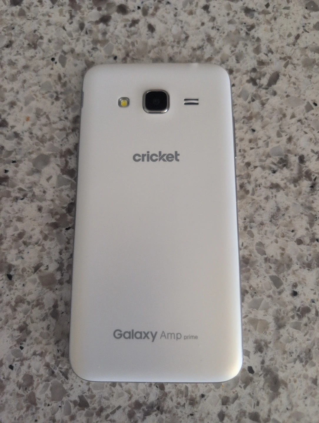 This is a white Samsung Galaxy Amp Prime phone. It's a Cricket Wireless model. The phone has a white front and back with silver trim. Cash only