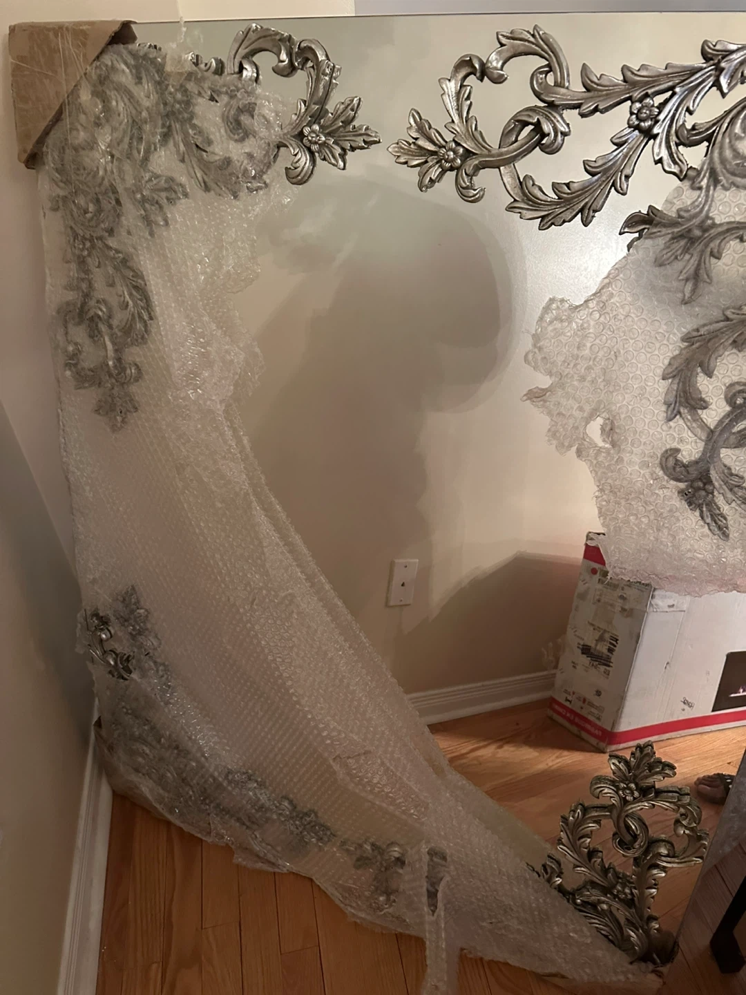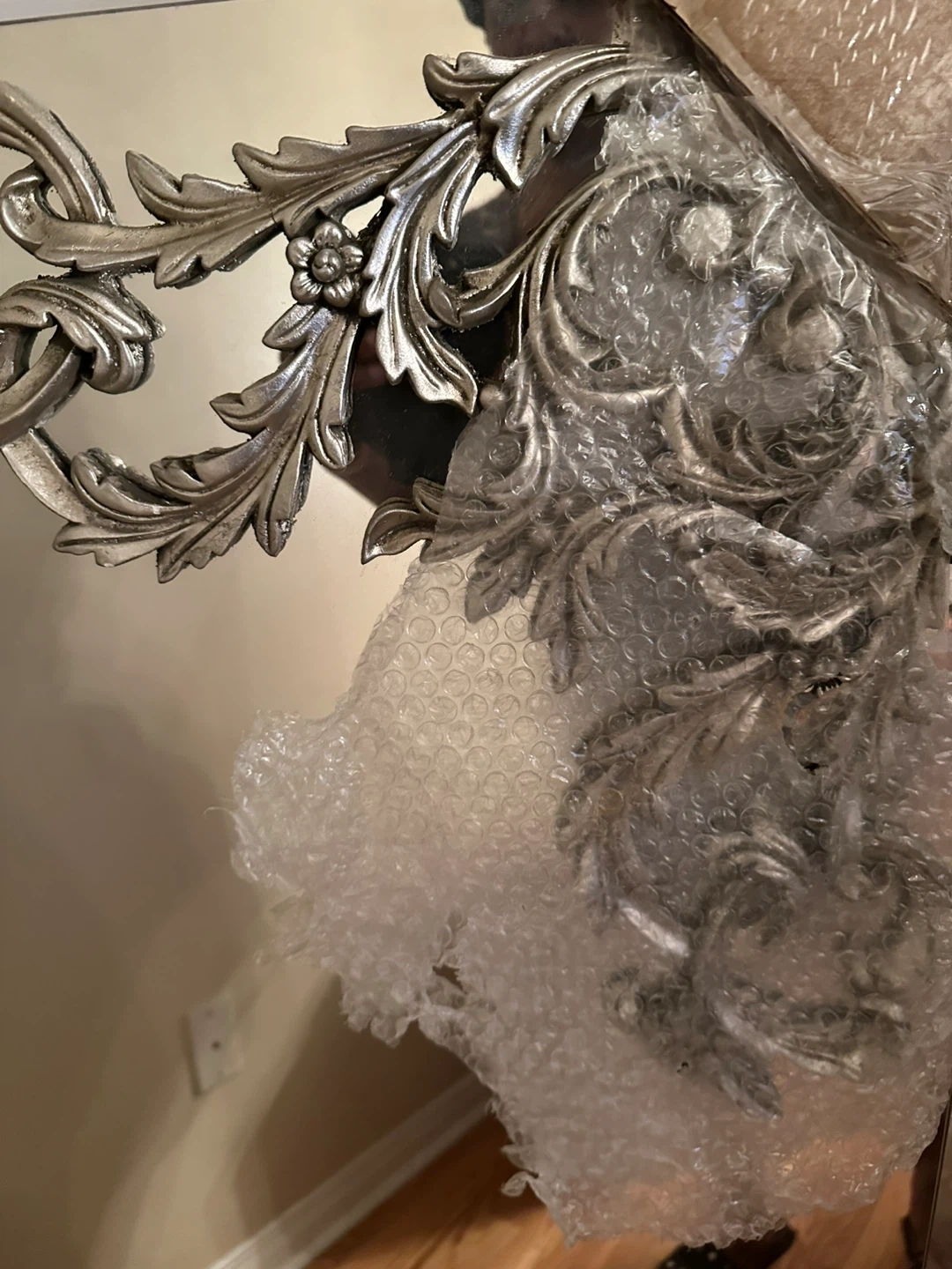 This is a Renwil decorative wall mirror with an ornate silver frame. It has intricate detailing and a vintage-inspired design. It's a beautiful statement piece. Mirror was over$3500