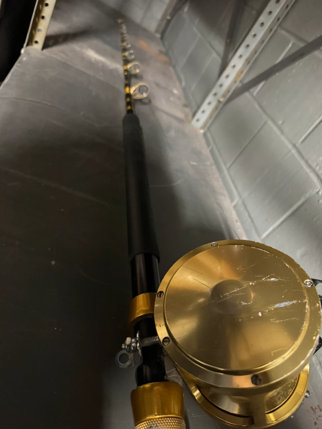 This is a PENN International II 50 TW fishing rod and reel combo. It's a gold-colored reel with line on it. This combo is ready for your next fishing trip!