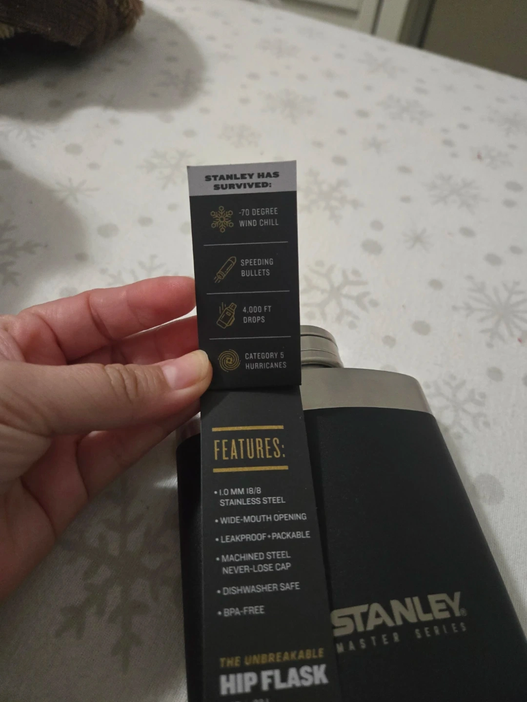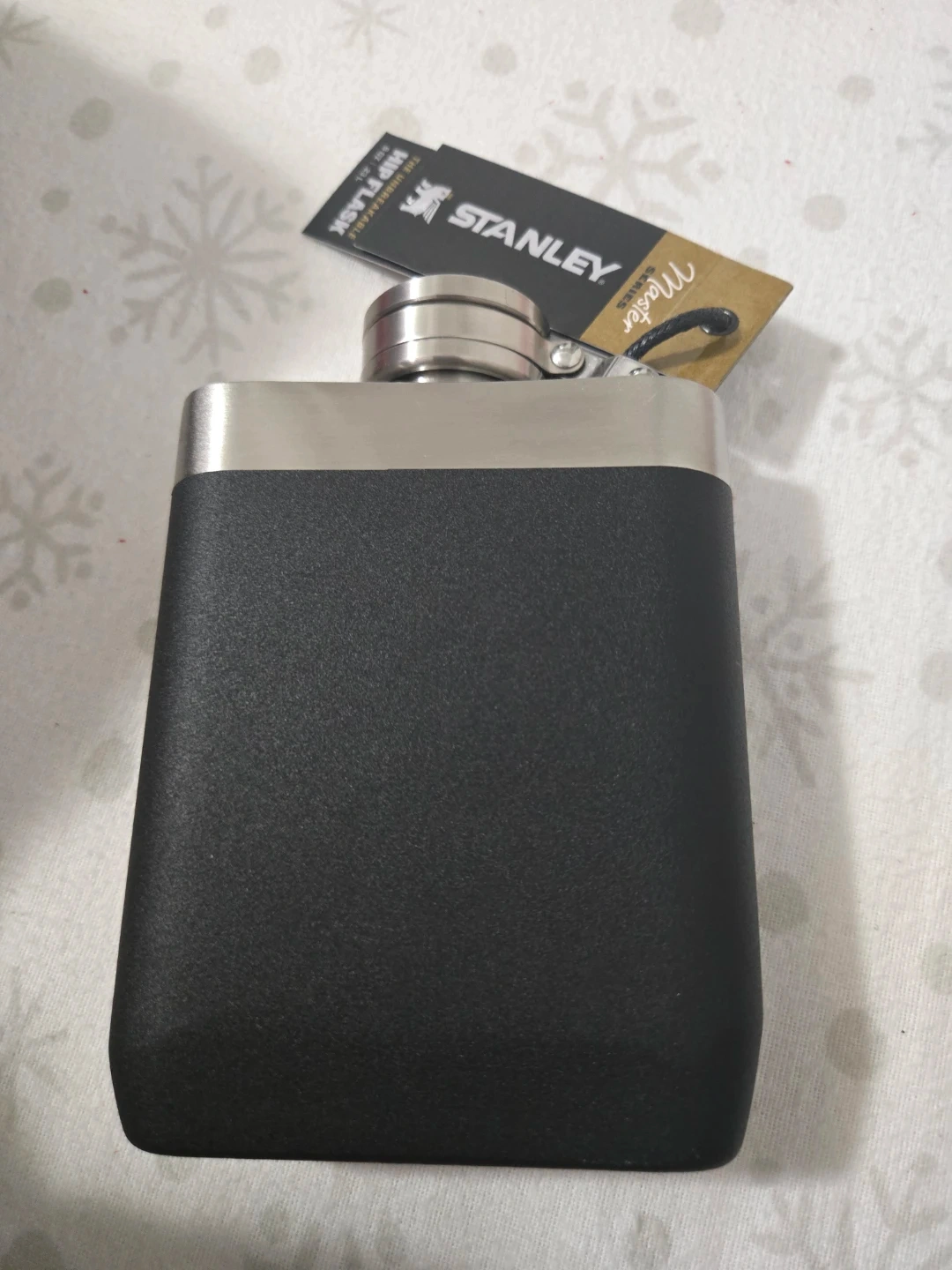 Selling a Stanley Master Series hip flask! It's a sleek black color and holds 8 oz / 236 mL. This flask is made with 1.0 mm 18/8 stainless steel and features a wide-mouth opening and a machined steel never-lose cap. It's also leakproof, packable, and dishwasher safe. This Stanley has survived -70 degree wind chill, speeding bullets, 4,000 ft drops, and Category 5 hurricanes!