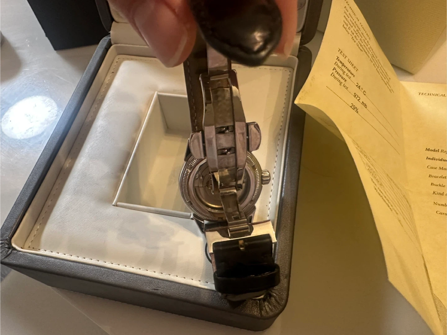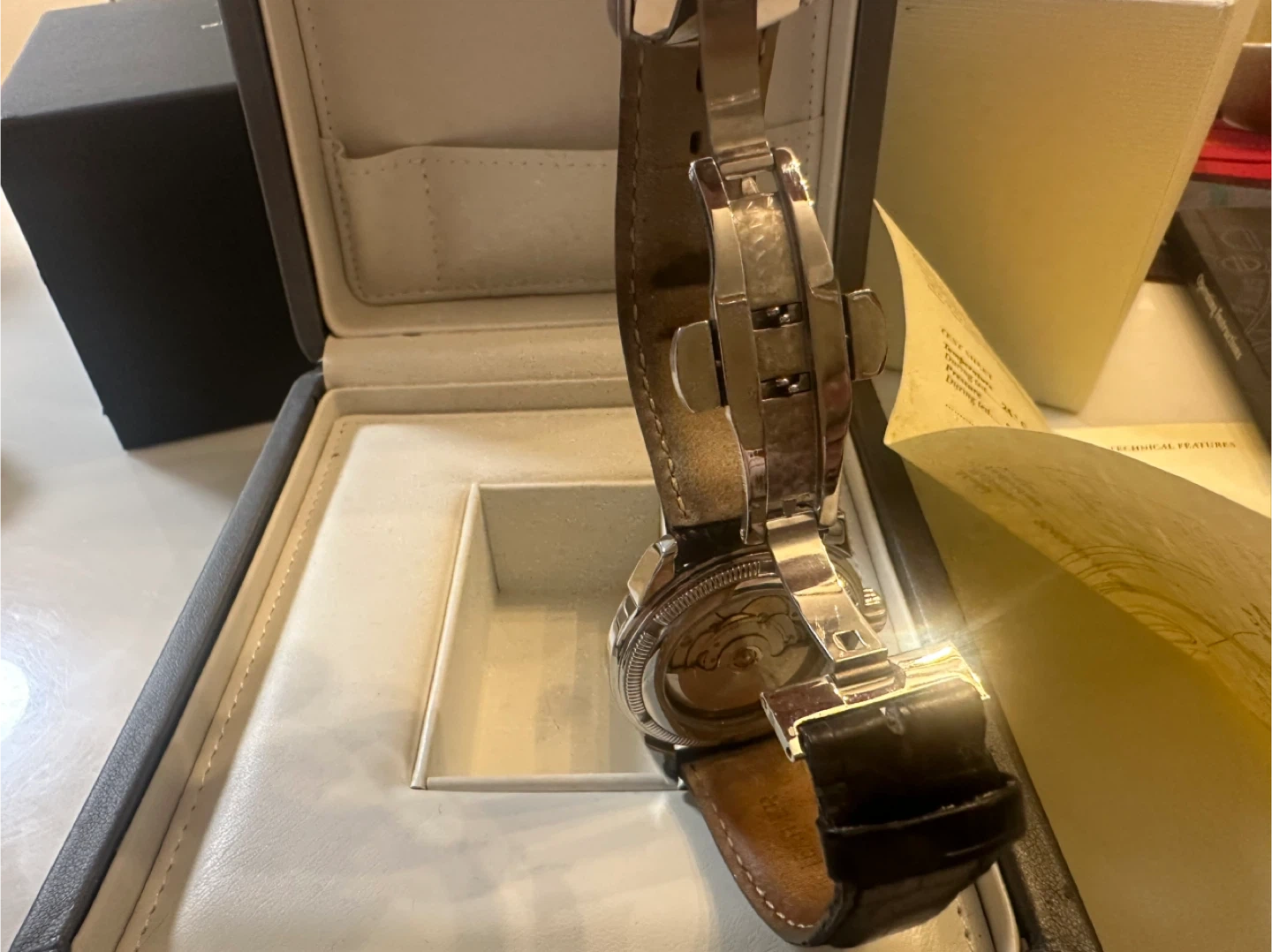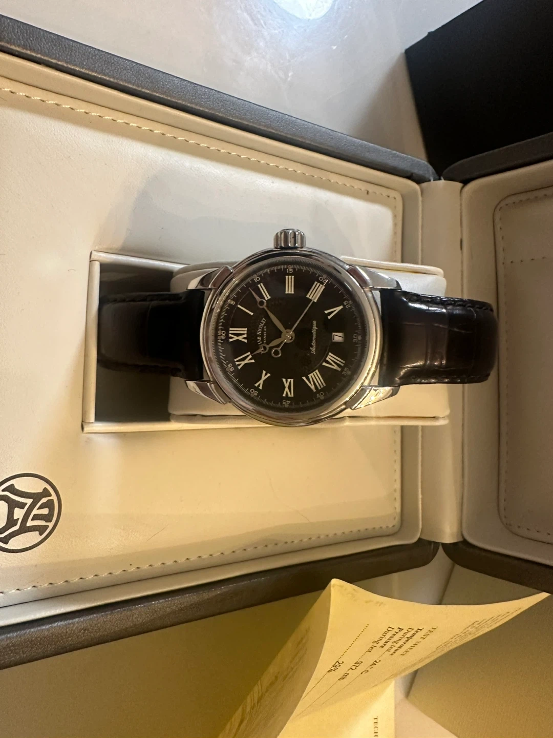 Selling an authentic Armand Nicolet self wind watch. It comes with its original box and documentation. The watch features a black clasp strap and a classic design. It's in great condition and ready for a new owner!