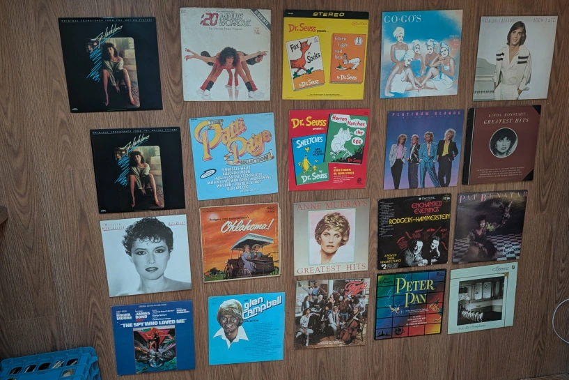 Collection of various vinyl records. Includes artists like Barry Manilow, Pat Benatar, and Linda Ronstadt. Records are a mix of genres and decades.
