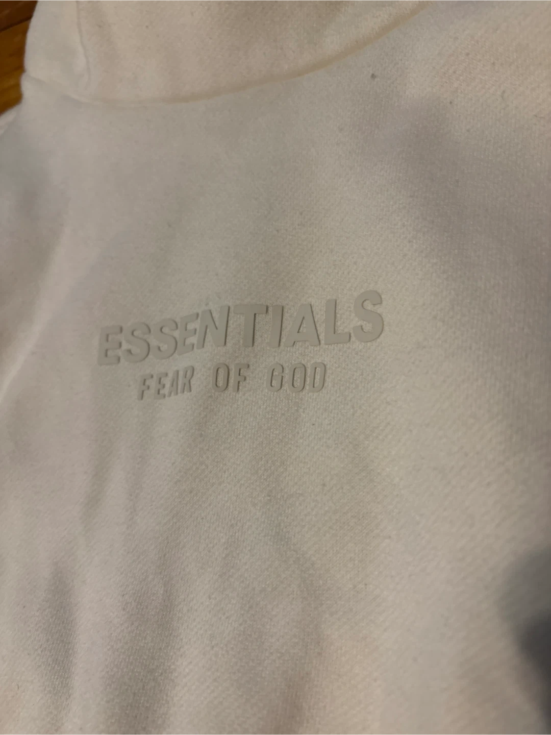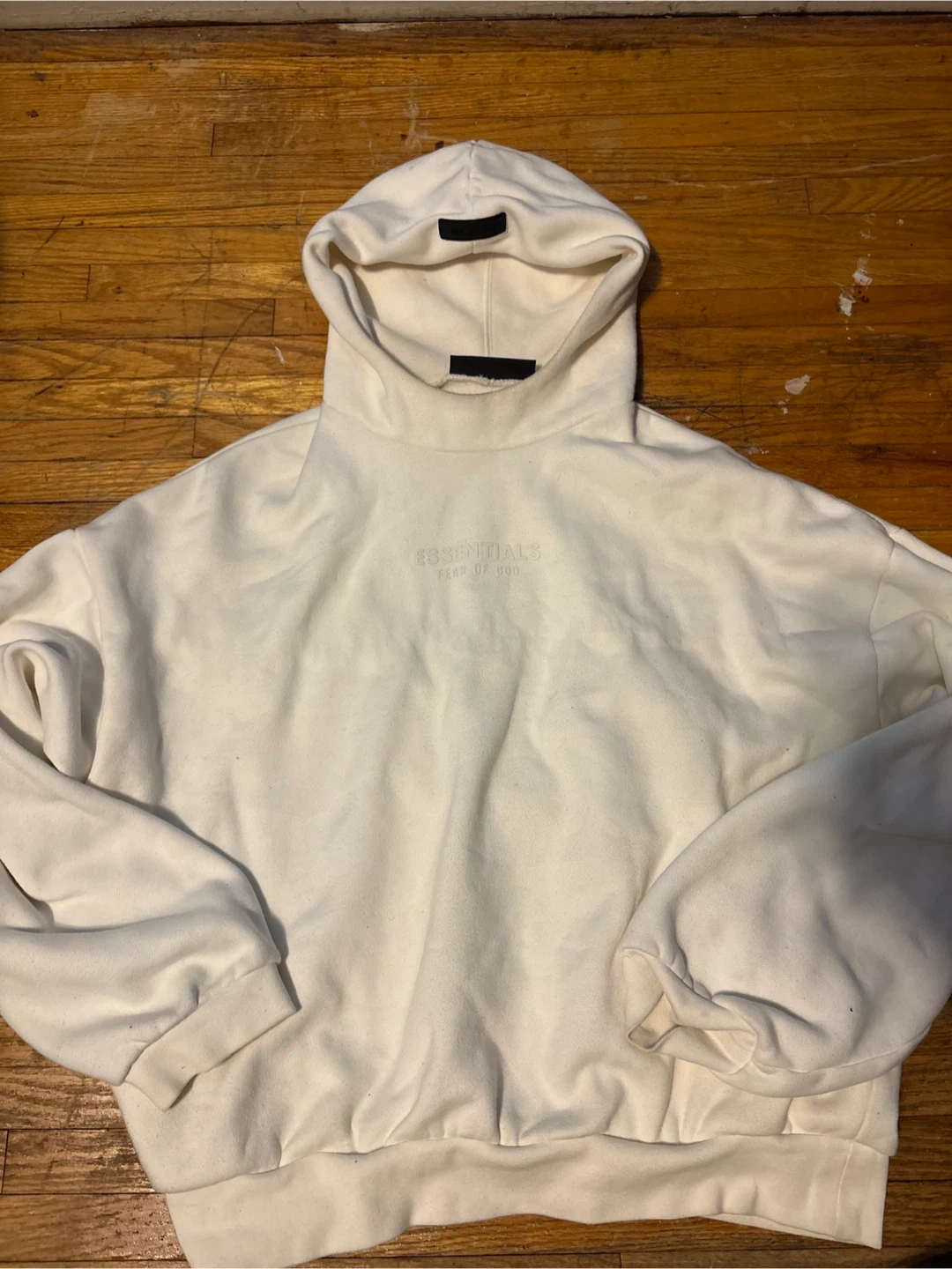 This is a cream-coloured hoodie from Fear of God Essentials. It's made with an 80% cotton and 20% polyester blend. The size is small.