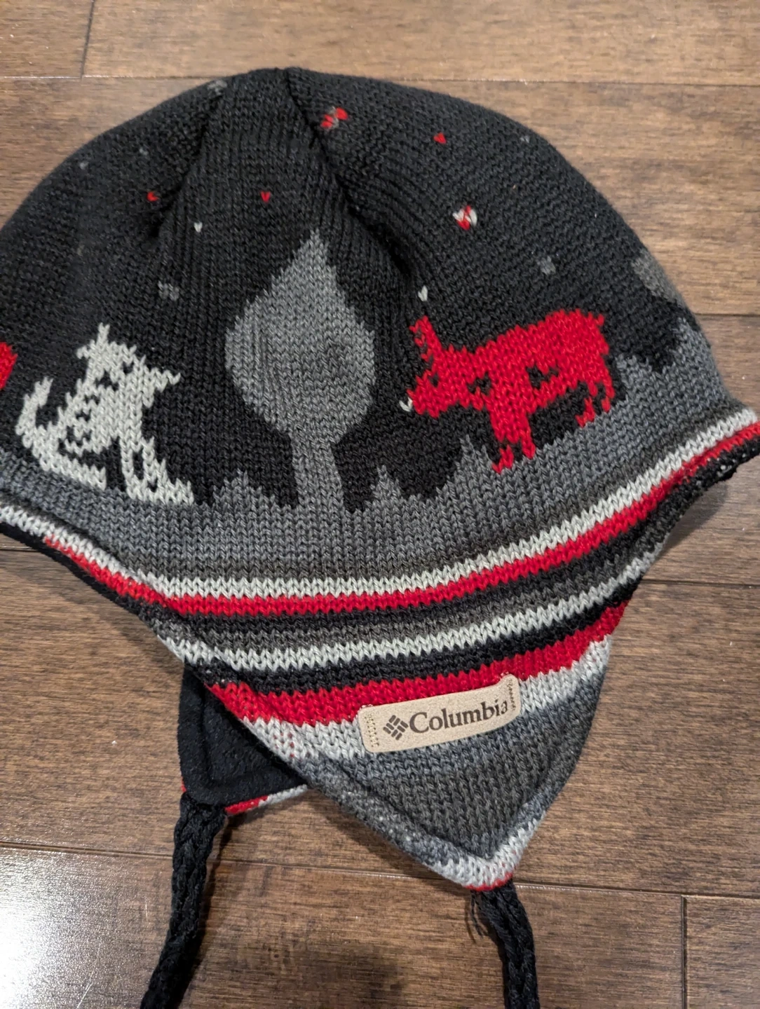This kid Columbia knit winter hat features a fun woodland animal print. It has ear flaps with tassels for extra warmth. The inside lining is designed for added insulation.