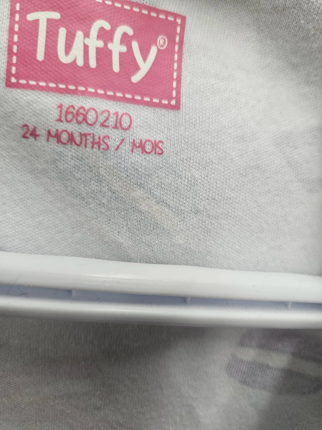 This Tuffy baby sleepsuit is perfect for cozy nights. It features a fun macaron and coffee cup print. Made for comfort and easy diaper changes with a zipper closure. Size 24 months.