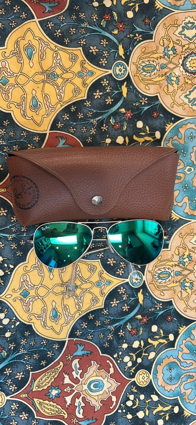 These are classic Ray-Ban Aviator sunglasses. They feature a gold-toned metal frame with vibrant green mirror lenses. Includes the original brown leather case. Perfect for sunny days!