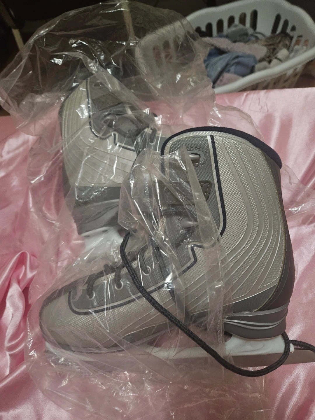 A pair of Reebok ice skates in a silver and grey colourway. Skates come with laces and protective blade covers. They're ready for the ice! Only available at pickup. They fit me and I usually use size 10