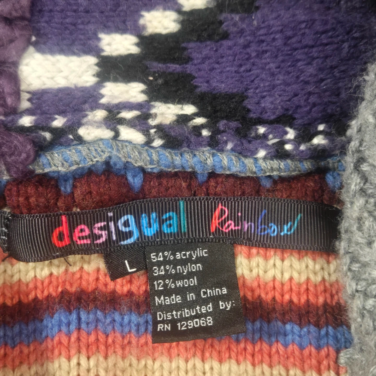 This Desigual Rainbow cardigan sweater is size large. It's made with 54% acrylic, 34% nylon, and 12% wool. The colourful patchwork design adds a unique touch to this piece.