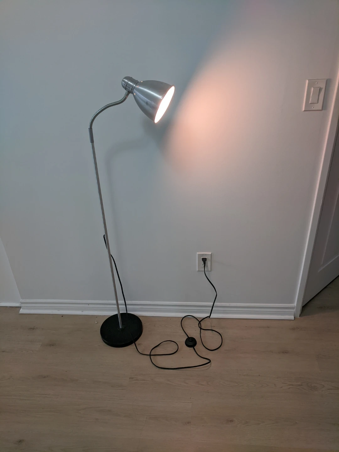 This is a silver, adjustable floor lamp with a black base. It features a flexible gooseneck for directing light. It has a foot pedal switch for easy operation. Great for reading or task lighting!
