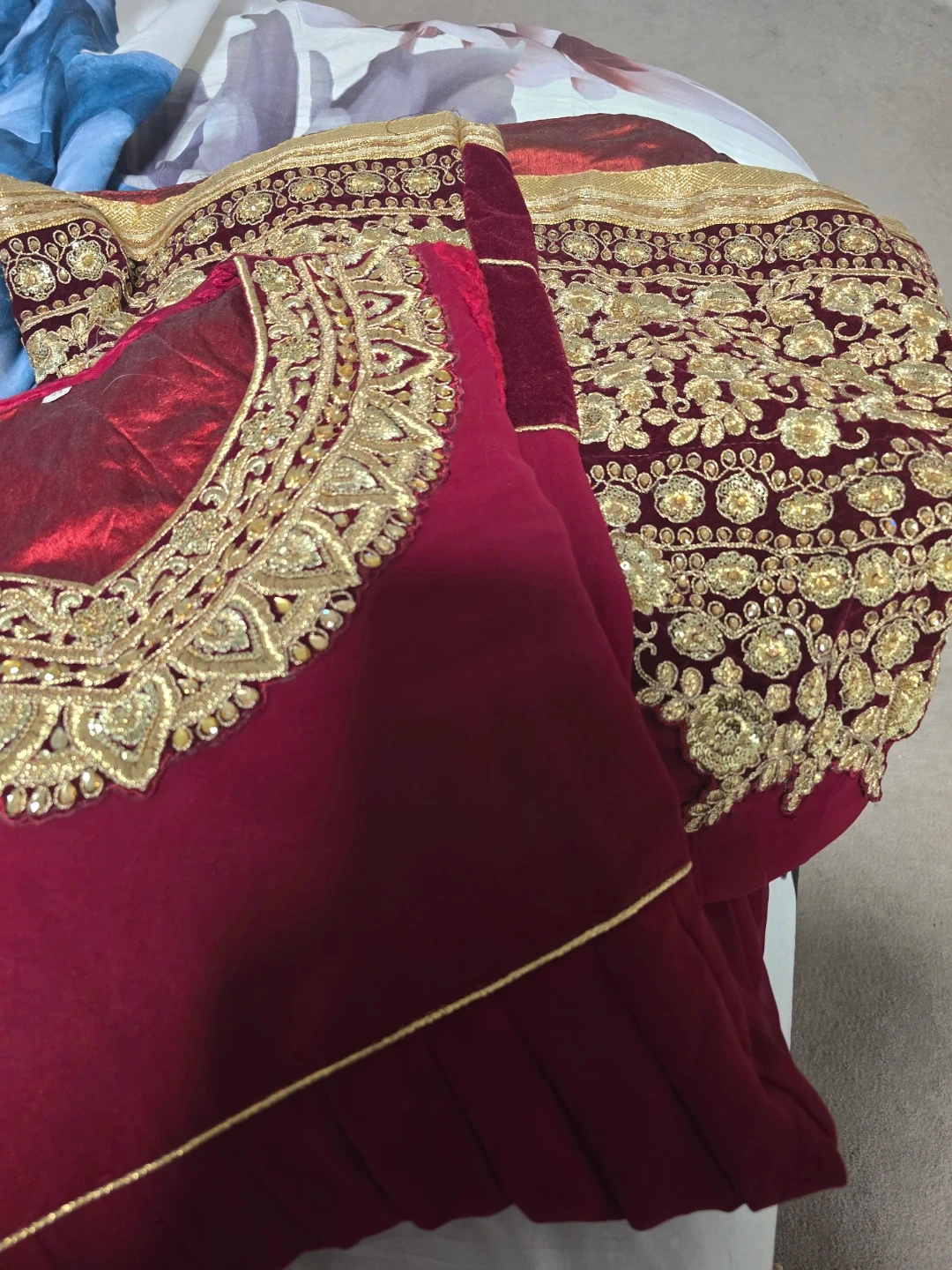 This is a beautiful red women's suit with intricate gold embroidery. It features detailed floral patterns on the sleeves and neckline. The fabric looks rich and is perfect for special occasions. This outfit would be stunning for any festive event or wedding!