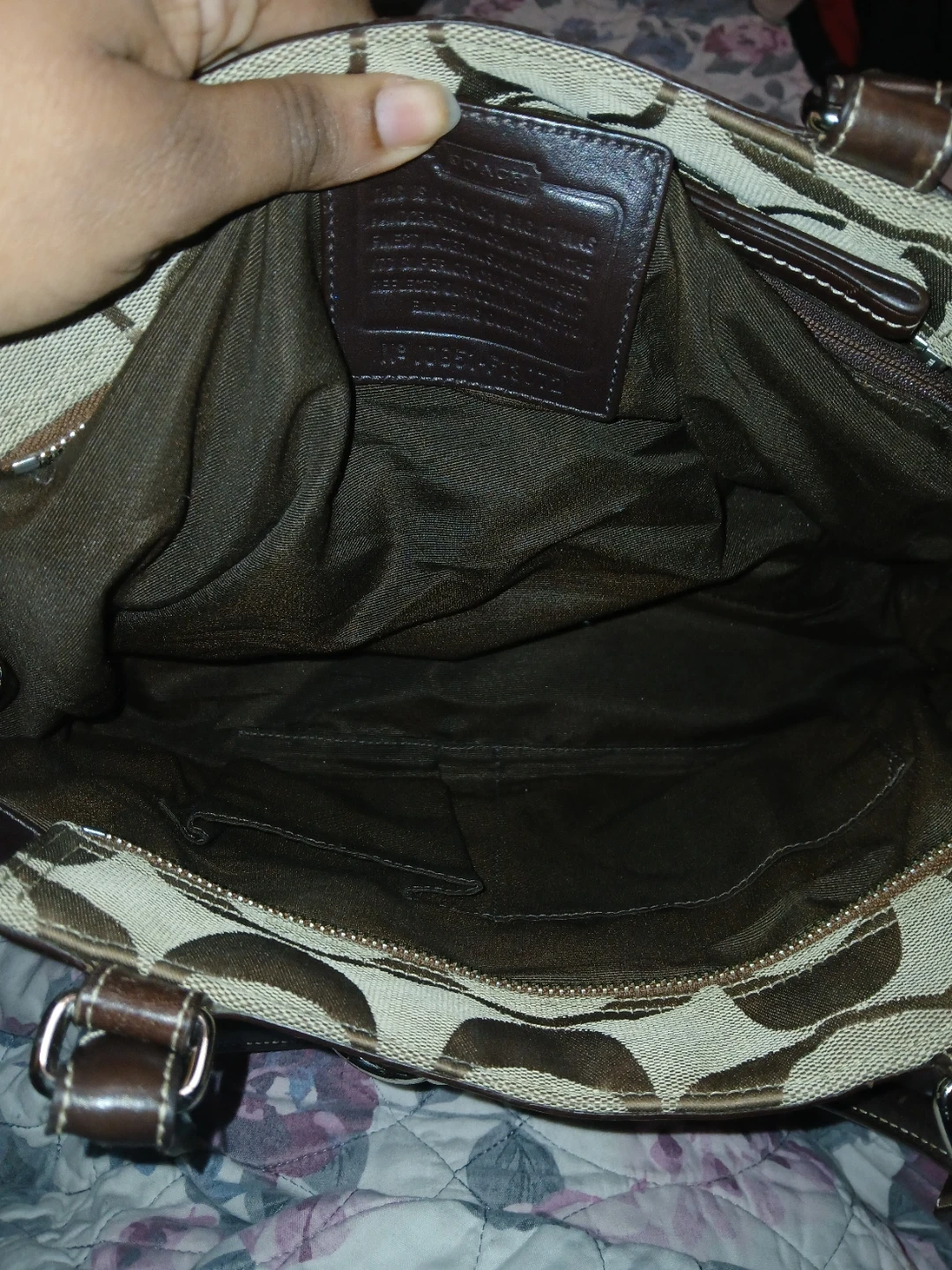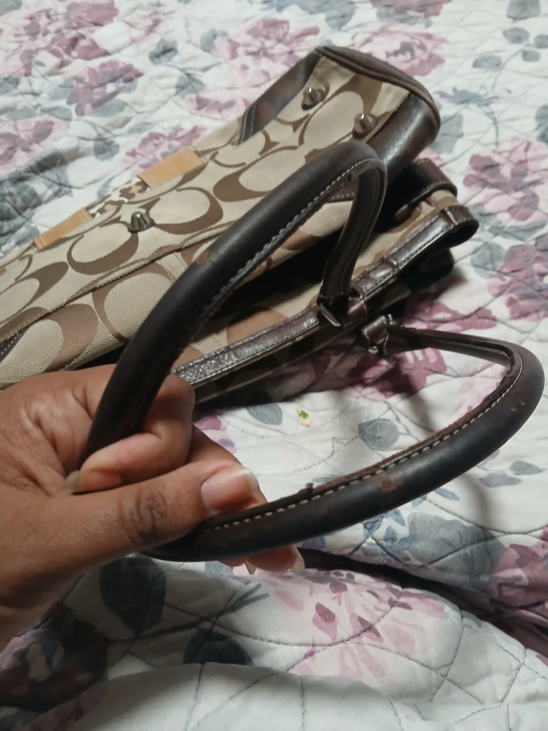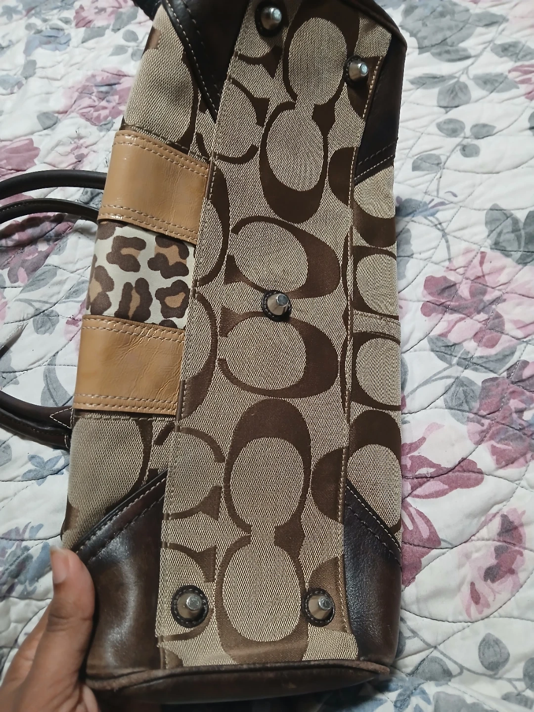 This is a Coach bag featuring the signature monogram pattern with brown leather trim and a leopard print accent panel. It has dual top handles and silver-toned hardware. This spacious tote is great for everyday use! Price is firm plz. Pick up midland and Danforth or 401 bay street or stc mall or Kennedy stn