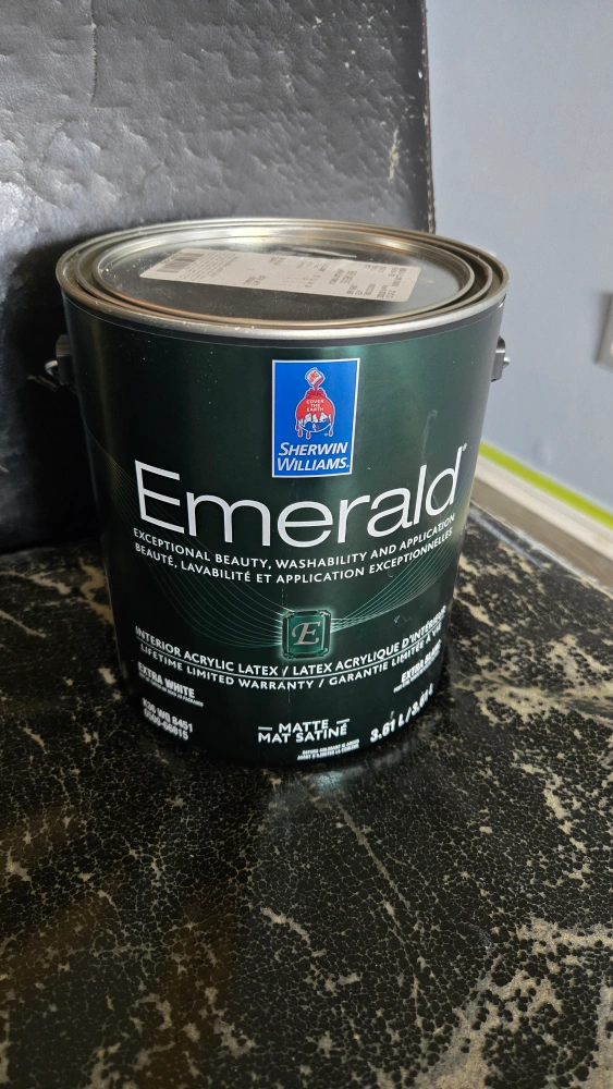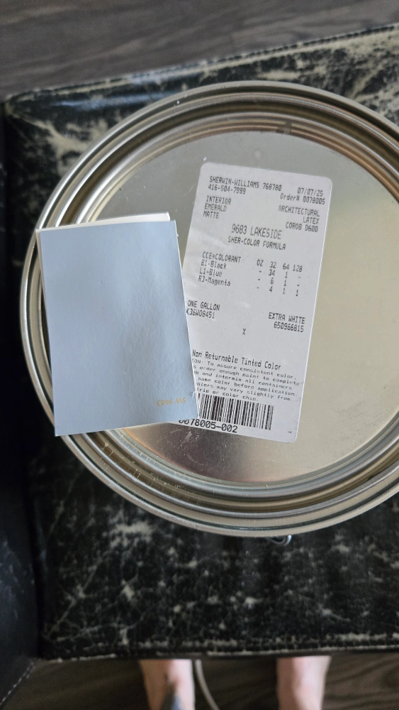 I have a can of Sherwin-Williams Emerald Interior Acrylic Latex paint in the colour Lakeside. It's a beautiful matte finish. The order date on the can is July 27, 2025. Perfect for your next painting project!