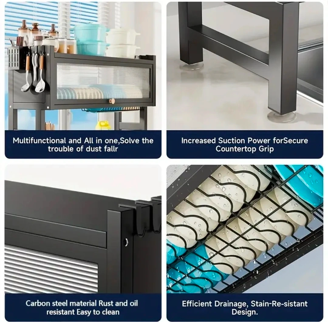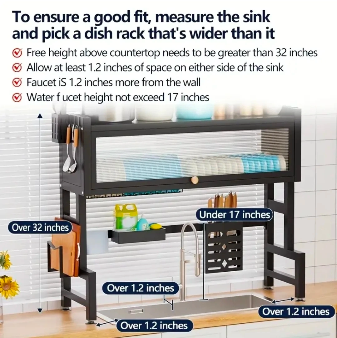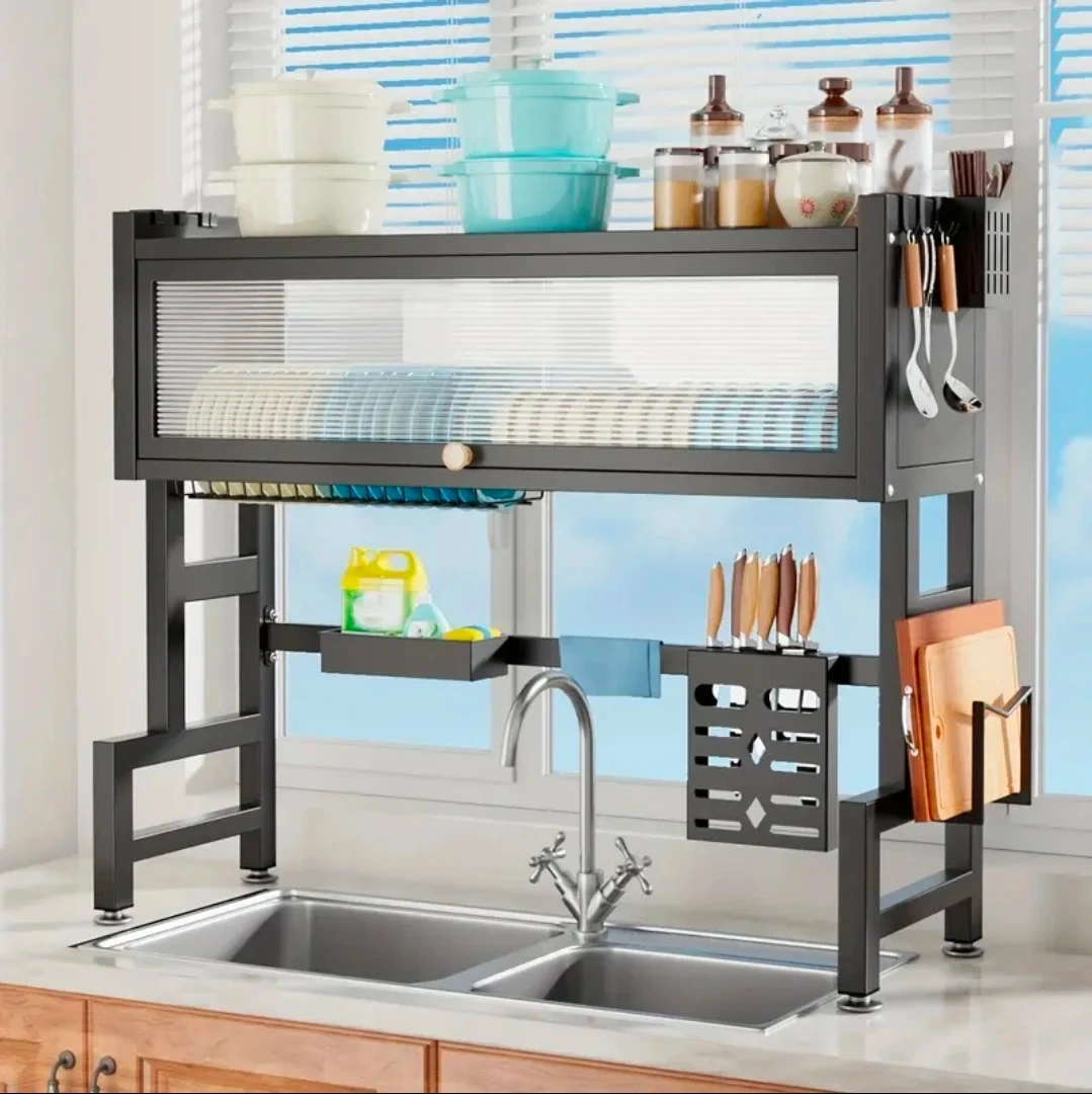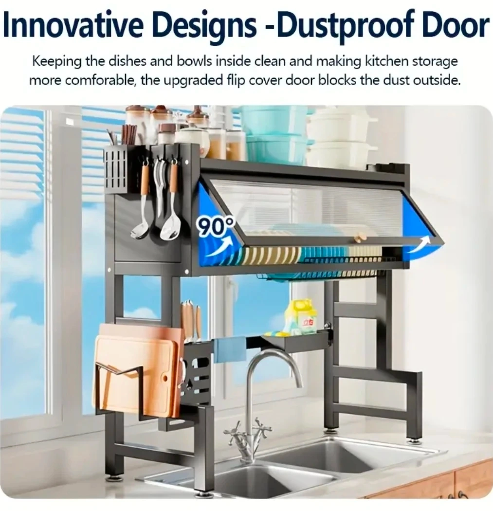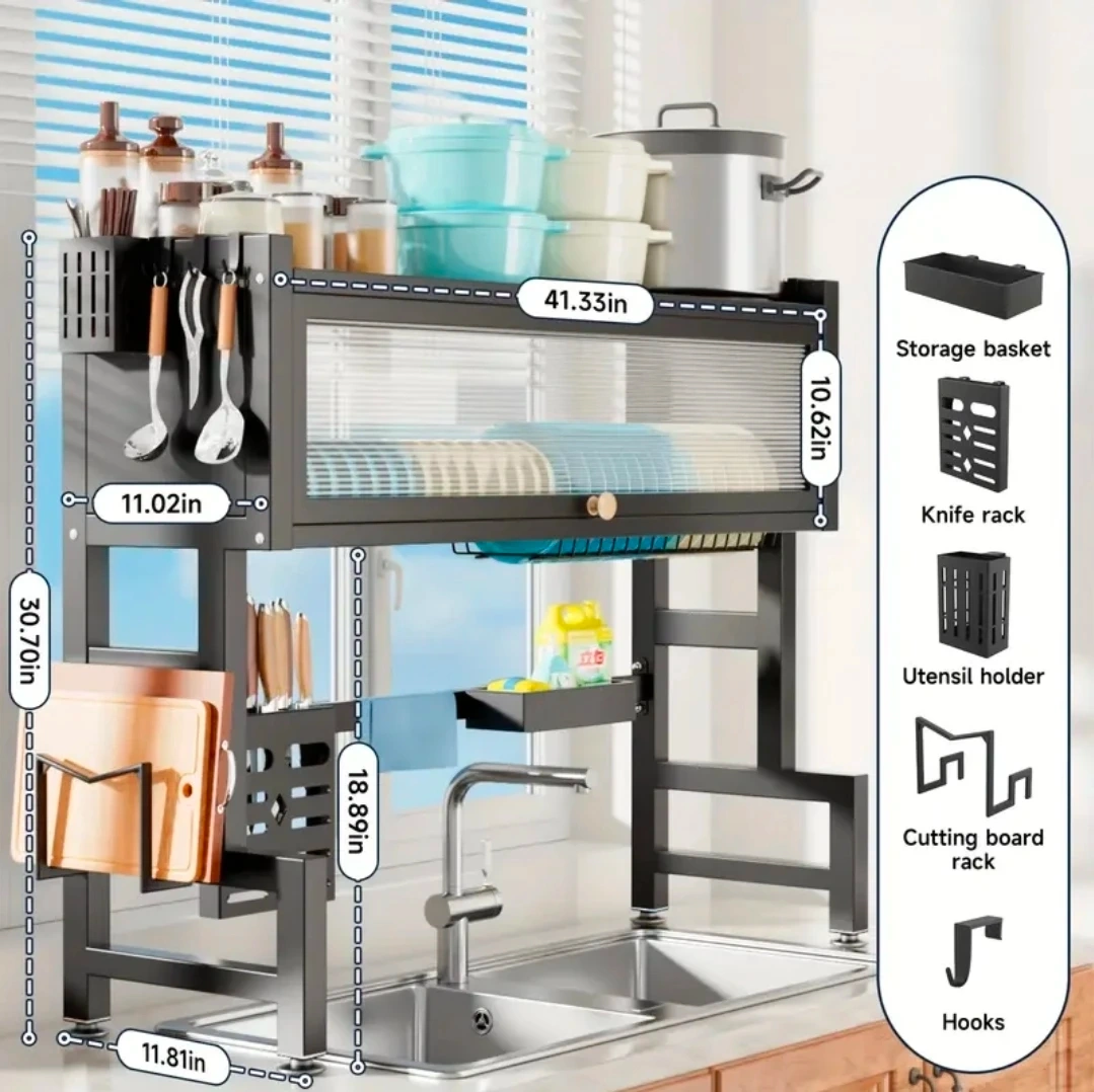 This over-the-sink dish rack offers ample storage with a dustproof door to keep dishes clean. It's made of rust and oil-resistant carbon steel and includes a knife rack, utensil holder, and cutting board rack. It measures 41.33in wide, 10.62in high, and 18.89in from the sink.