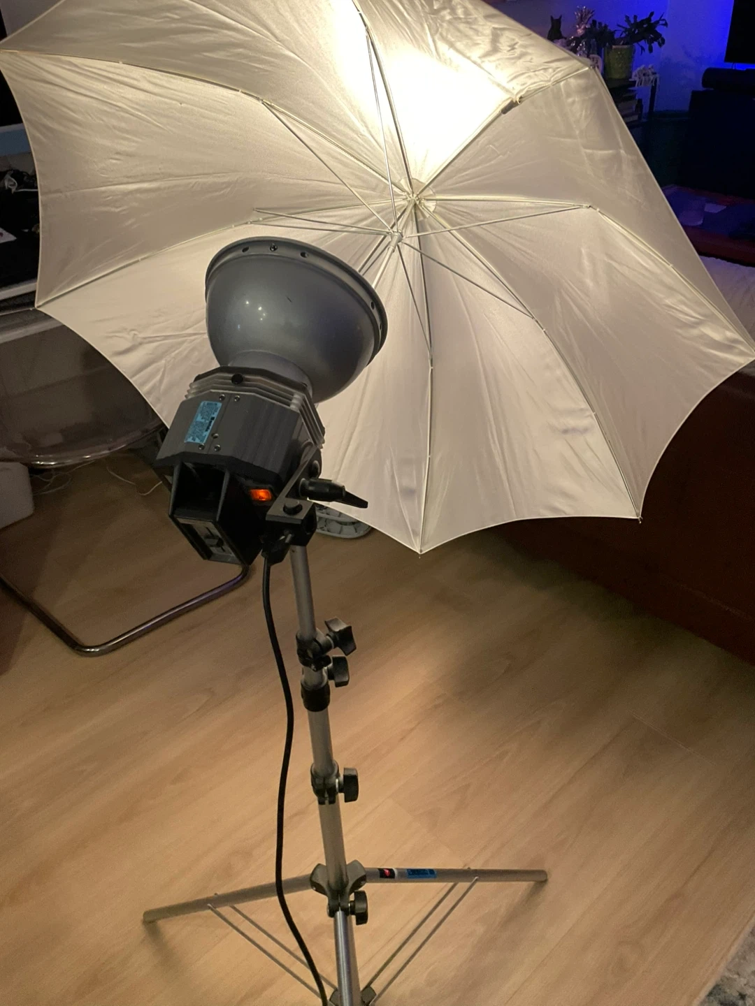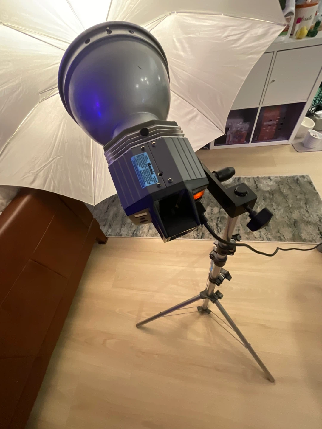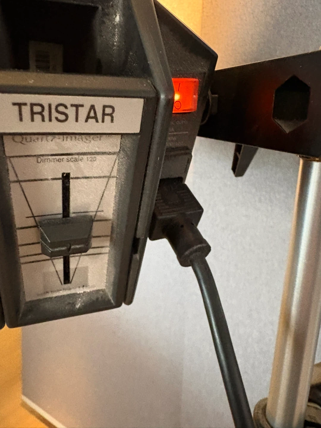 This Tristar Quartz Imager light unit offers adjustable brightness with a dimmer scale up to 120. It includes a stand and a diffusion umbrella for versatile lighting setups. Perfect for photography studios!