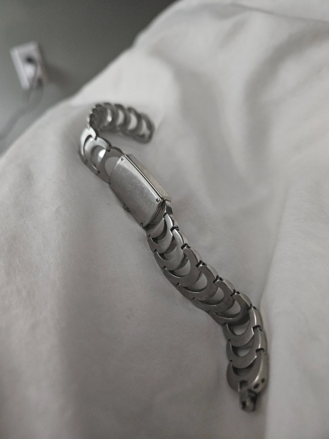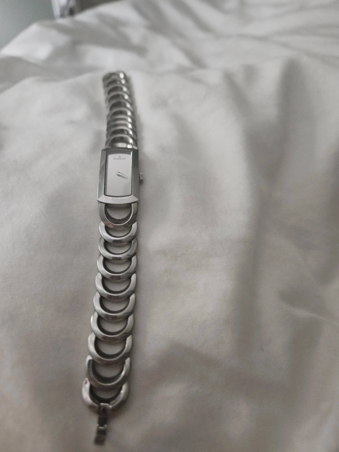 This is a stylish Movado ladies watch with a silver-tone metal band. It features a rectangular face and a durable metal construction. It's a classic timepiece for everyday wear.