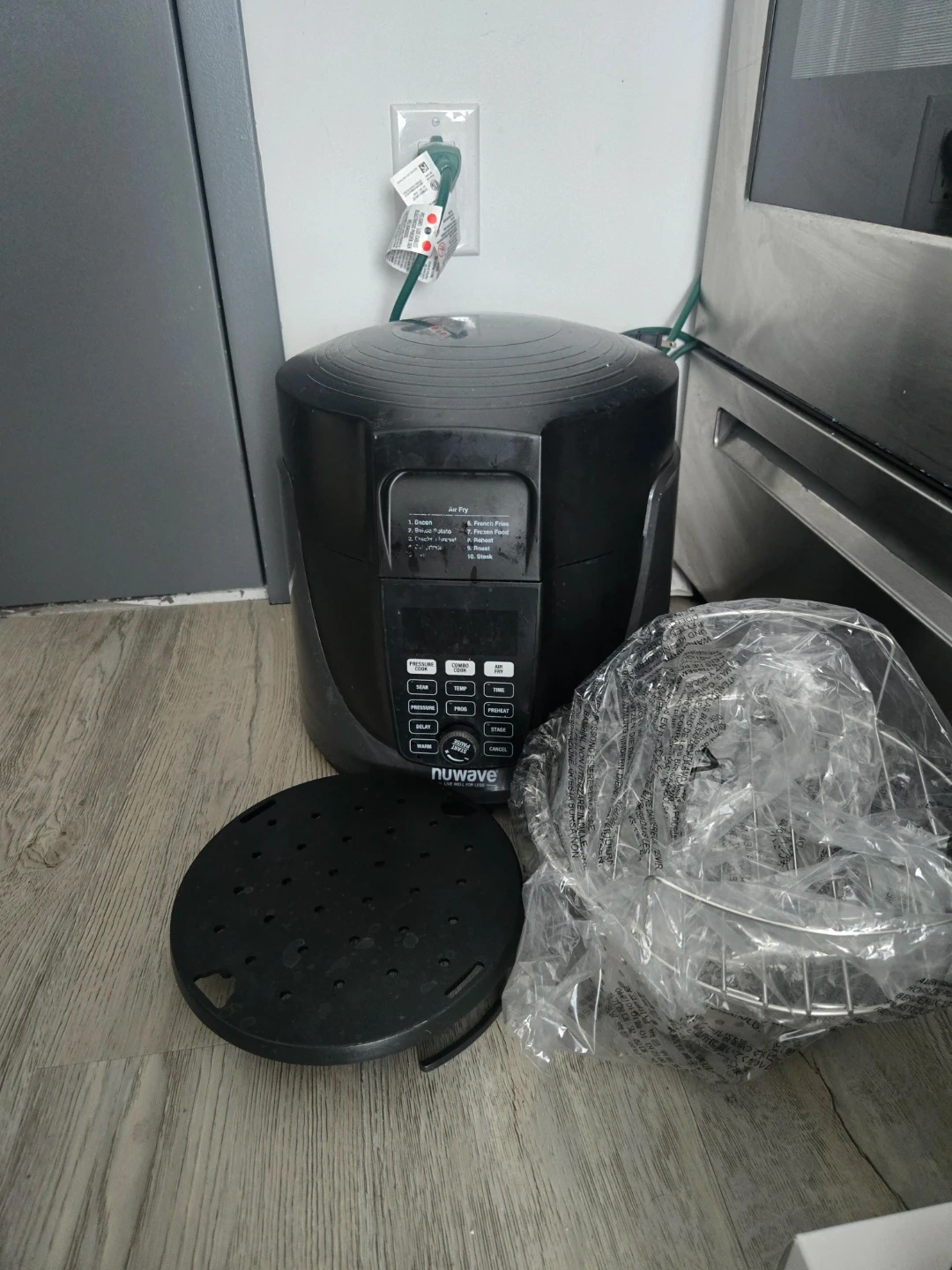 This is a Nuwave air fryer and pressure cooker combo. It comes with multiple accessories including racks and a basket. It's black and has a digital display with various cooking presets.