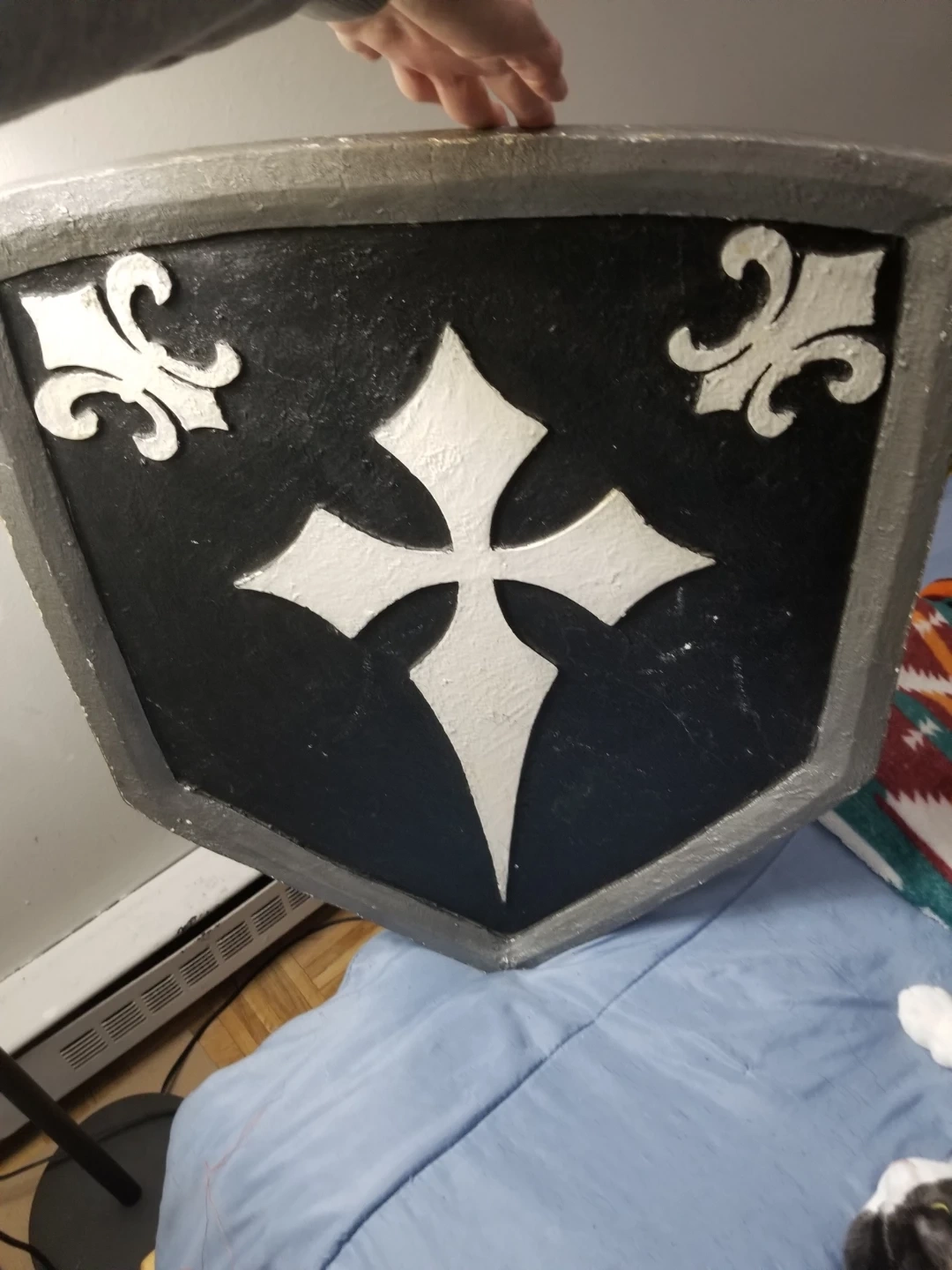 This is a decorative shield with a black background and a white cross emblem. It has two fleur-de-lis symbols on the sides. Straps on the back for display. Likely made from foam or plastic with a painted finish.