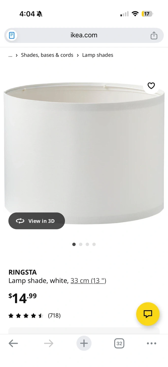 It's a RINGSTA lamp shade from IKEA. White colour and 33 cm (13") in size. Fabric material. Great for brightening up any room!