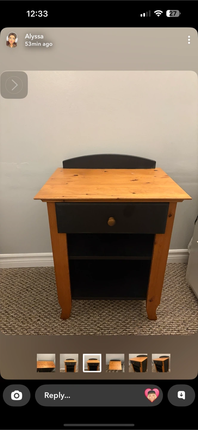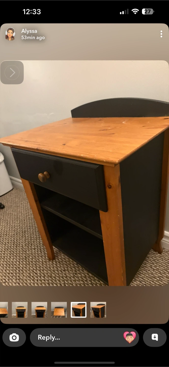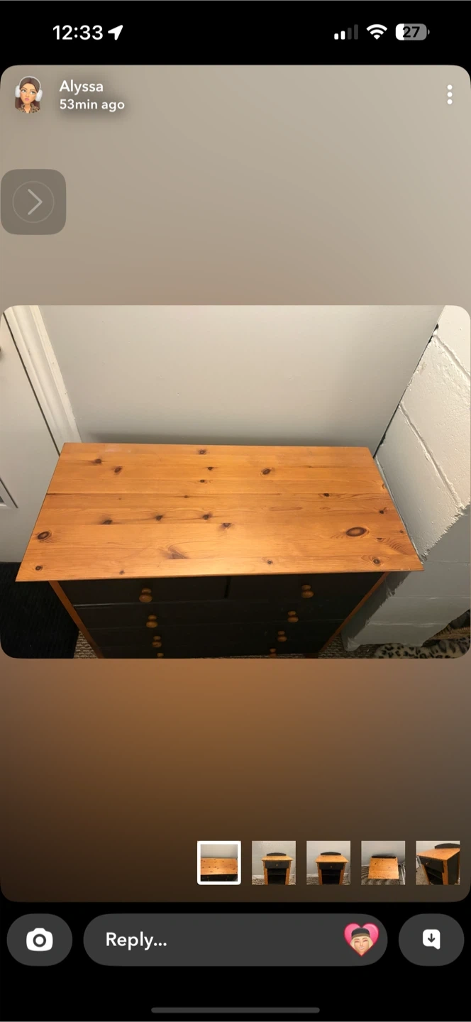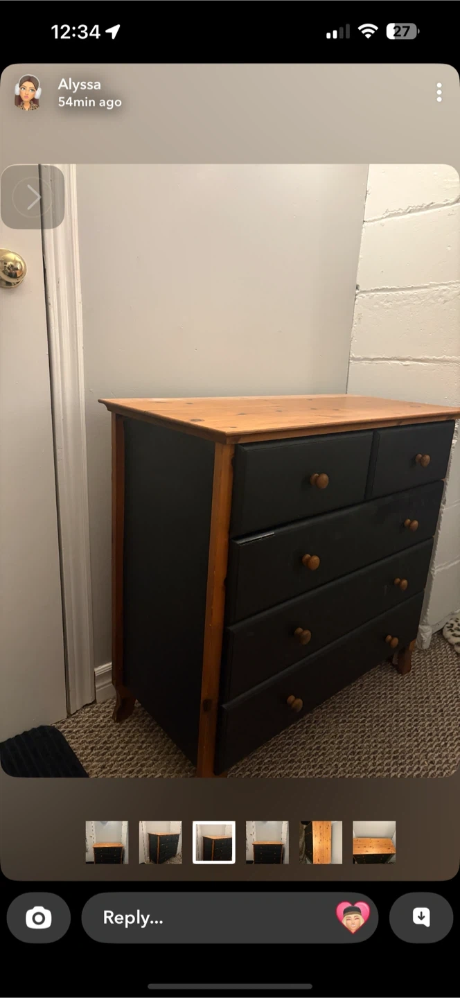 Wooden dresser with a pine top and black drawers. It has a total of 6 drawers for storage. This dresser would be handy for organizing clothes or linens.
