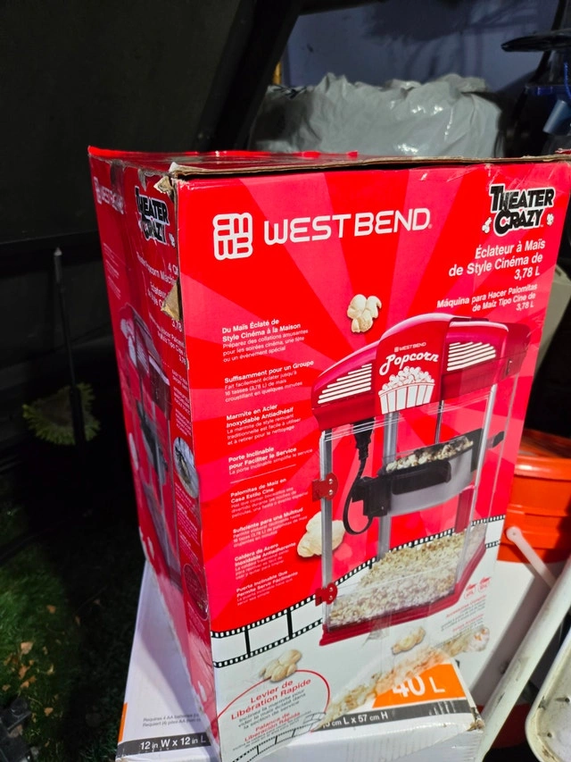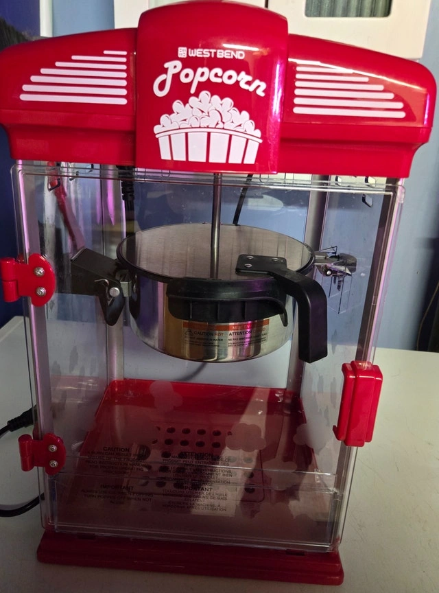 Enjoy fresh, movie-theater-style popcorn at home with this West Bend popcorn machine. It features a classic cinema design and a 4-quart capacity, perfect for family movie nights, parties, or gatherings. Easy to use and clean, delivering delicious popcorn in minutes. Key Features: 4QT Large Capacity, Theater-Style Design, Nonstick Kettle for easy cleaning, Quick Performance, Easy Serving. Condition: Used - Good. For Sale By: Owner.