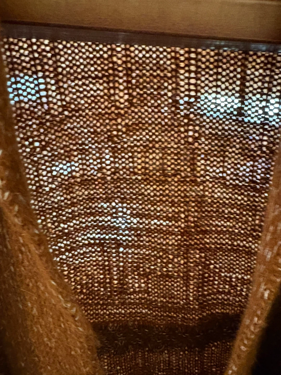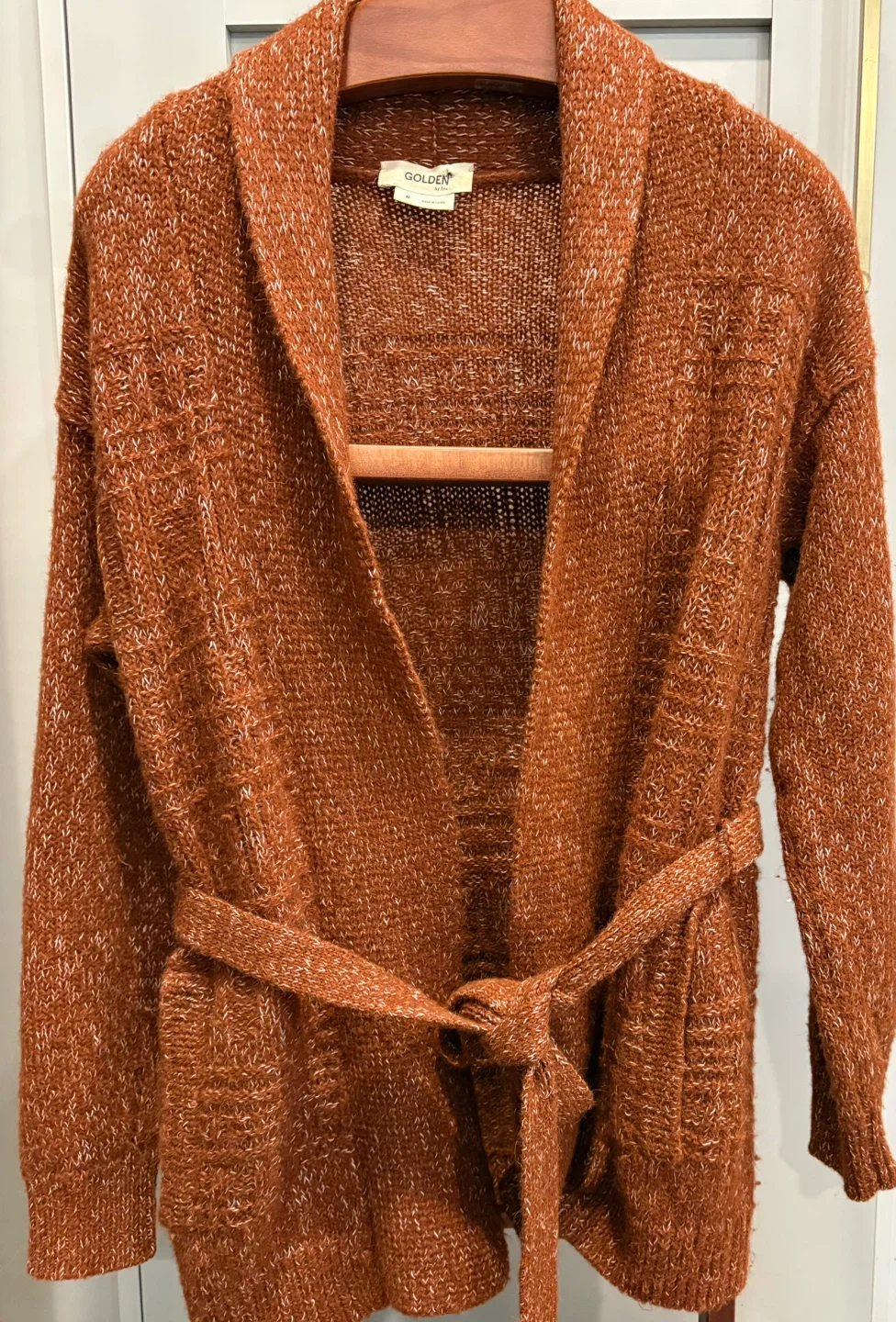 cozy rust-coloured cardigan features a shawl collar and a tie belt. Size Medium, made in China.