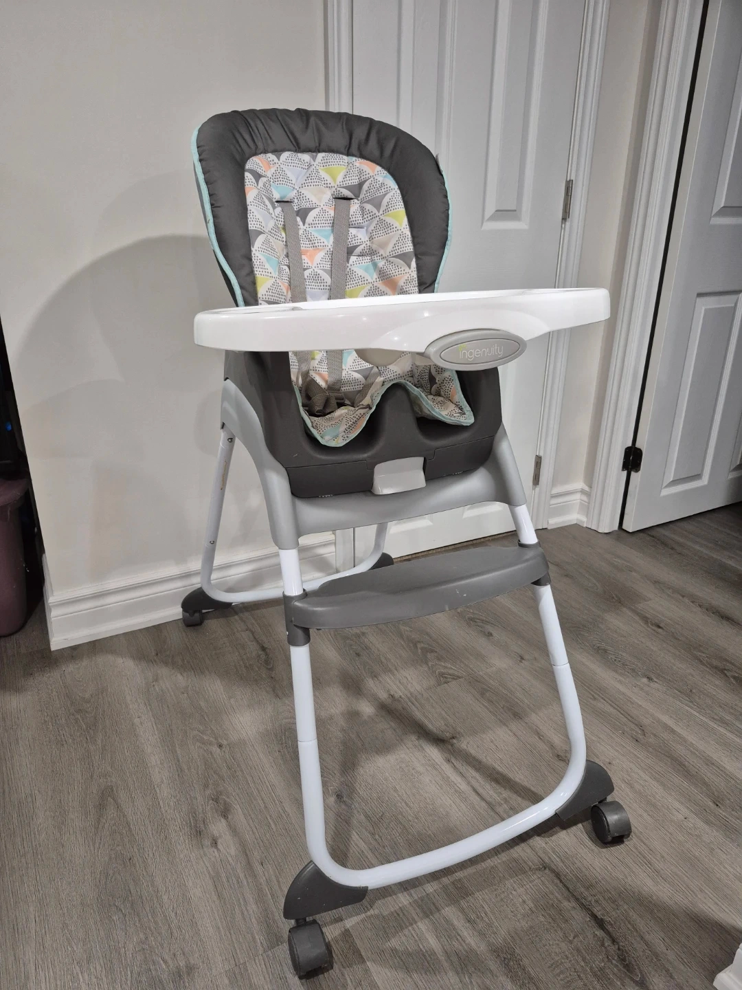 Ingenuity baby high chair with a removable tray. Features a comfy padded seat with a fun geometric pattern. Adjustable harness for safety. Easy to wipe clean.
