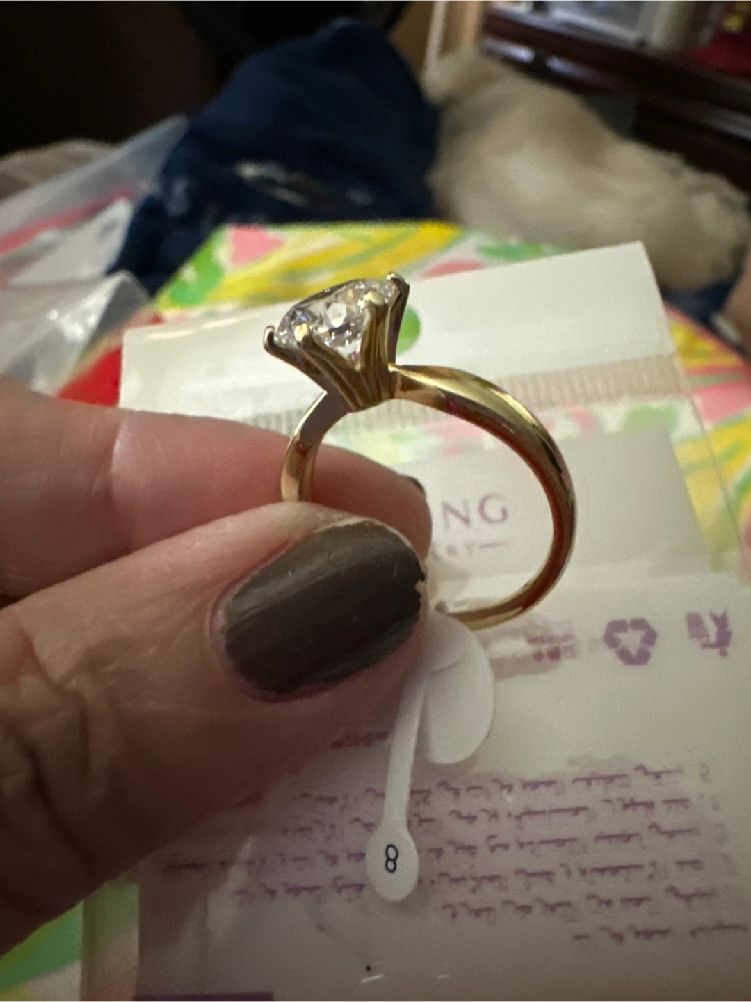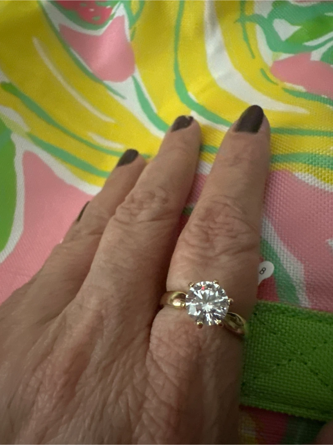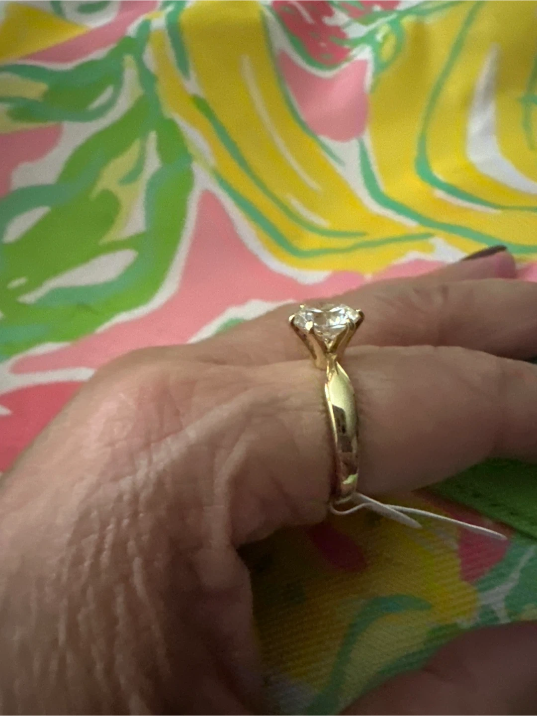 This beautiful gold engagement ring features a large, sparkling cubic zirconia stone. The band is a classic yellow gold. It's a size 8.