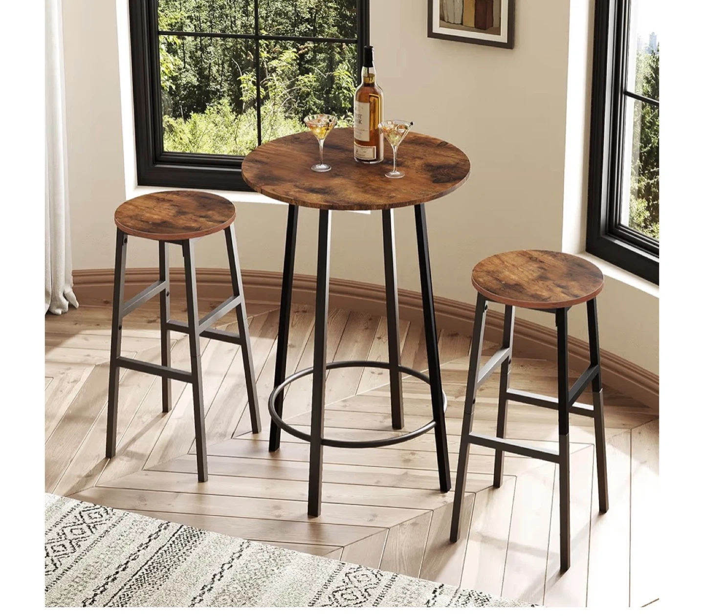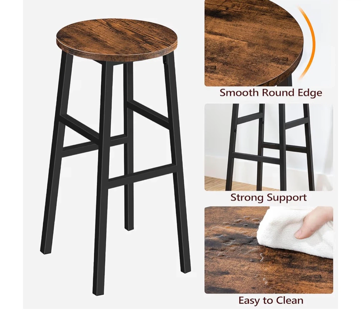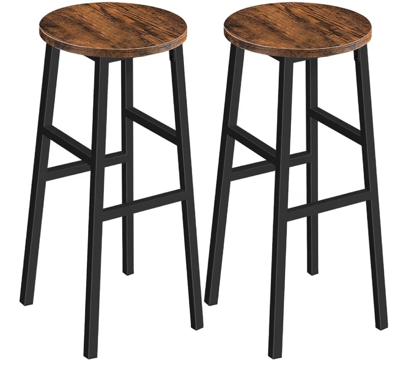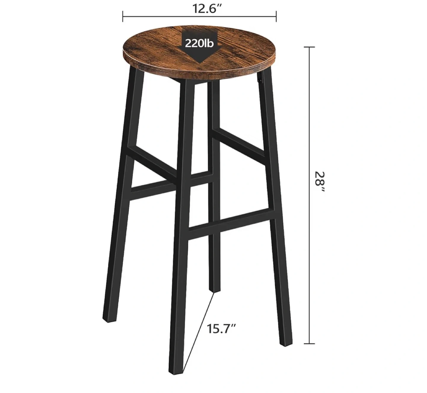 These bar stools have a rustic wood top and black metal legs. They stand 28 inches tall with a 12.6-inch diameter seat and a 15.7-inch base. Each stool supports up to 220 lbs.