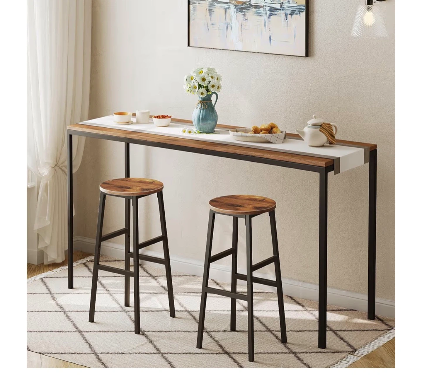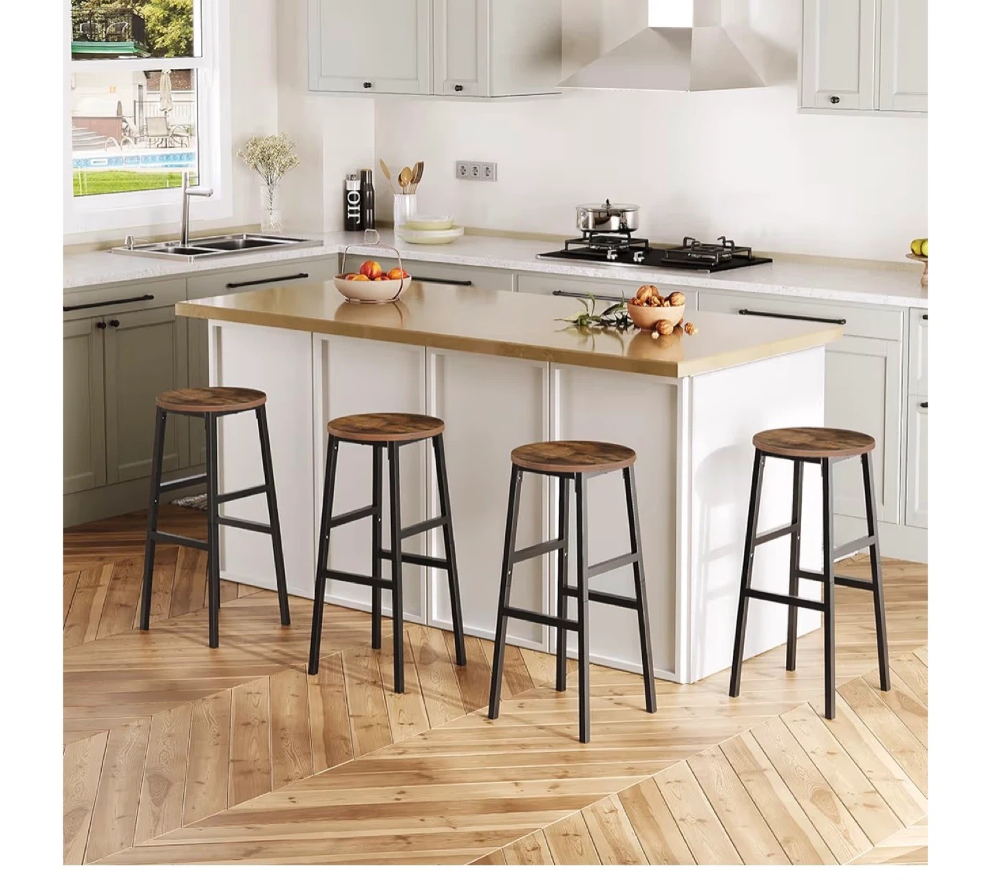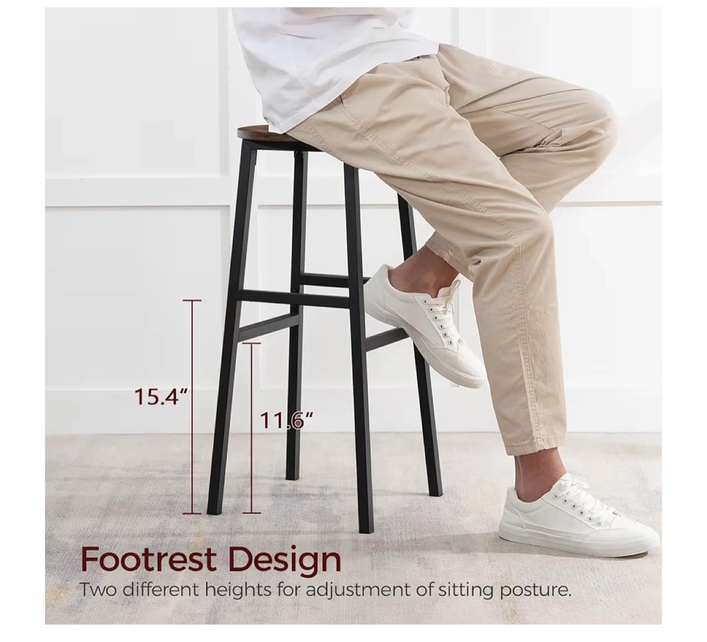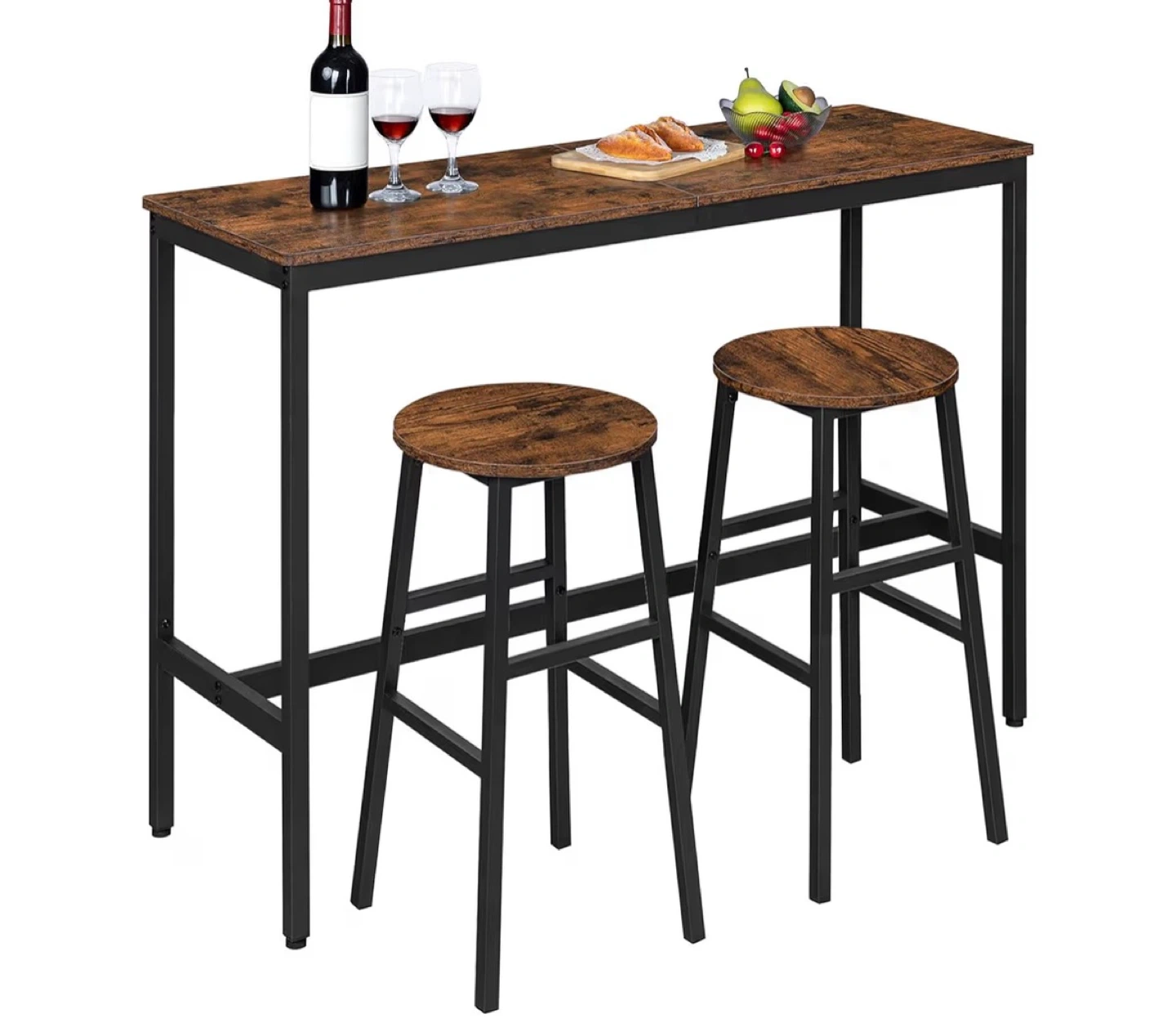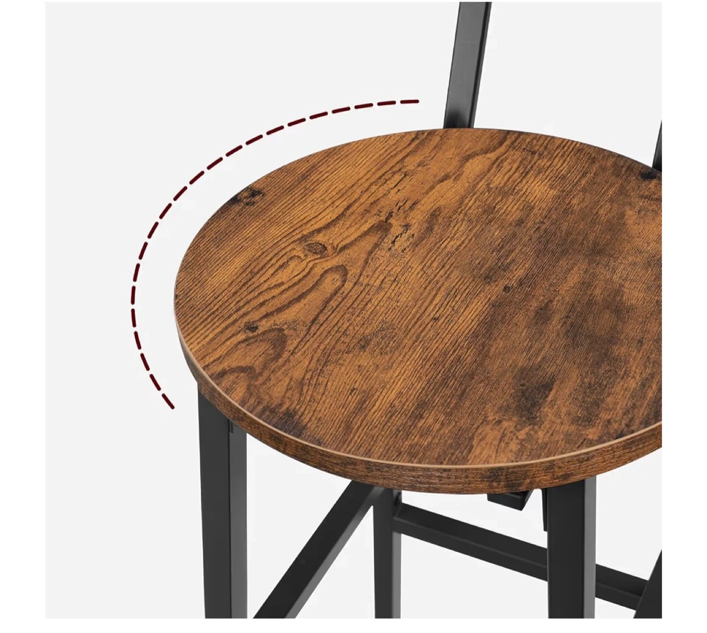 These bar stools have a rustic wood top and black metal legs. They stand 28 inches tall with a 12.6-inch diameter seat and a 15.7-inch base. Each stool supports up to 220 lbs.