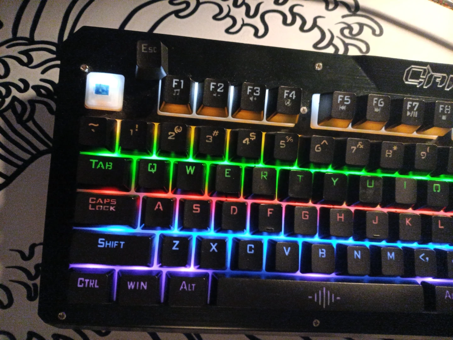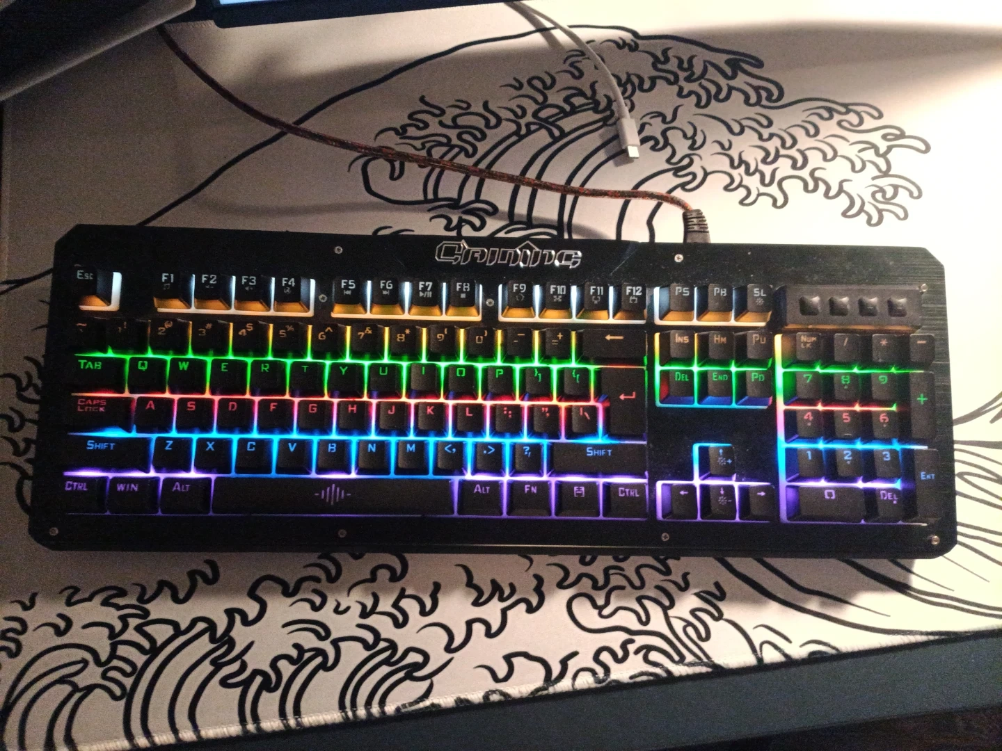 It has Blue Switches And Idk the brand but This mechanical gaming keyboard features vibrant RGB backlighting with multiple lighting effects. It has a durable metal frame and dedicated media keys for easy control. Built for gaming, it offers responsive key presses for an enhanced experience!