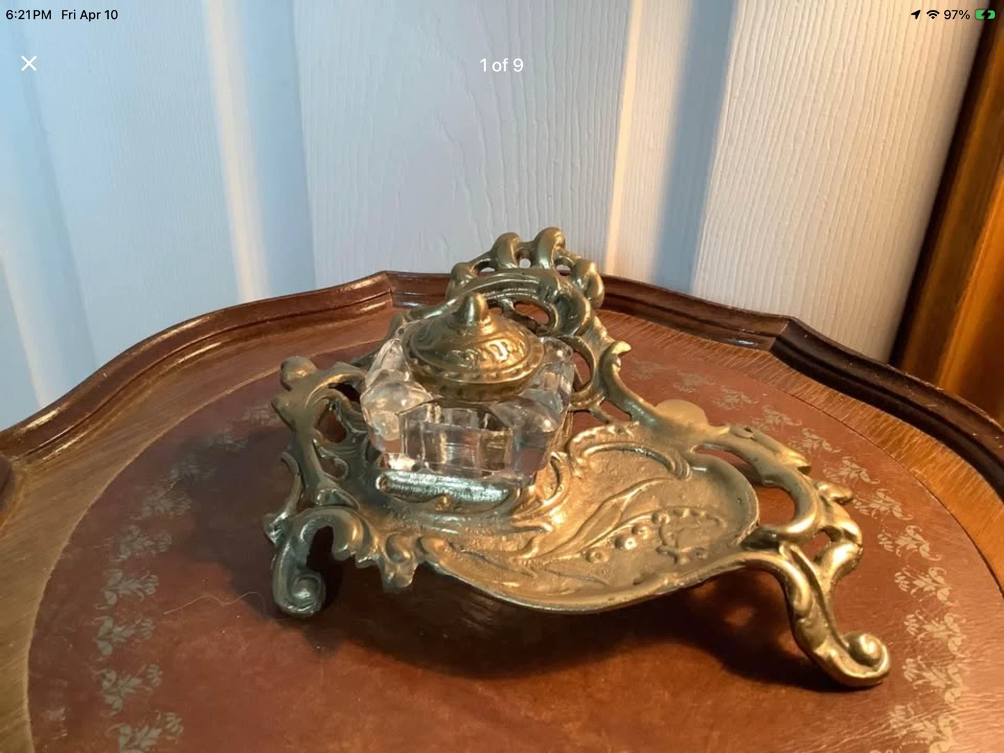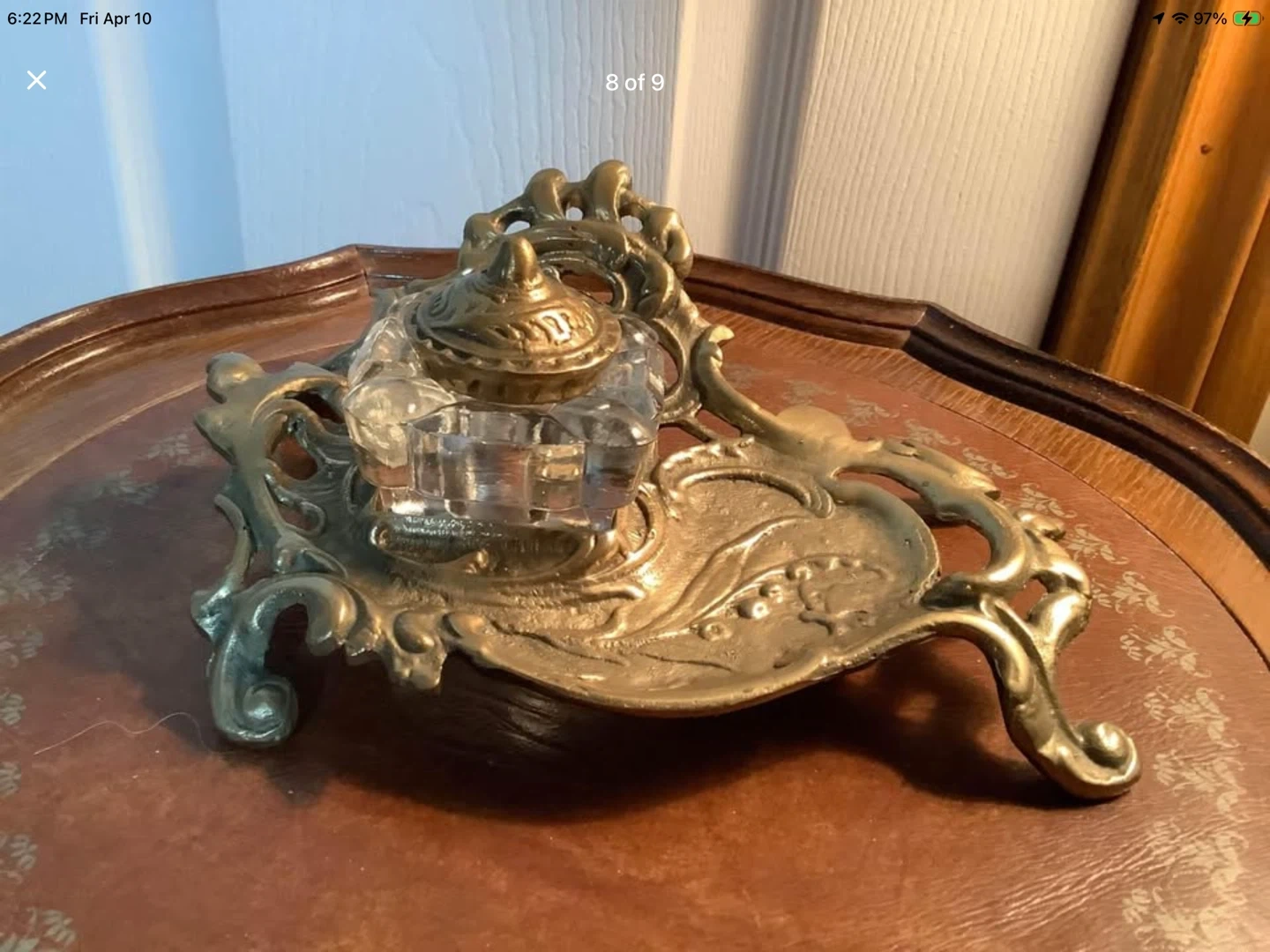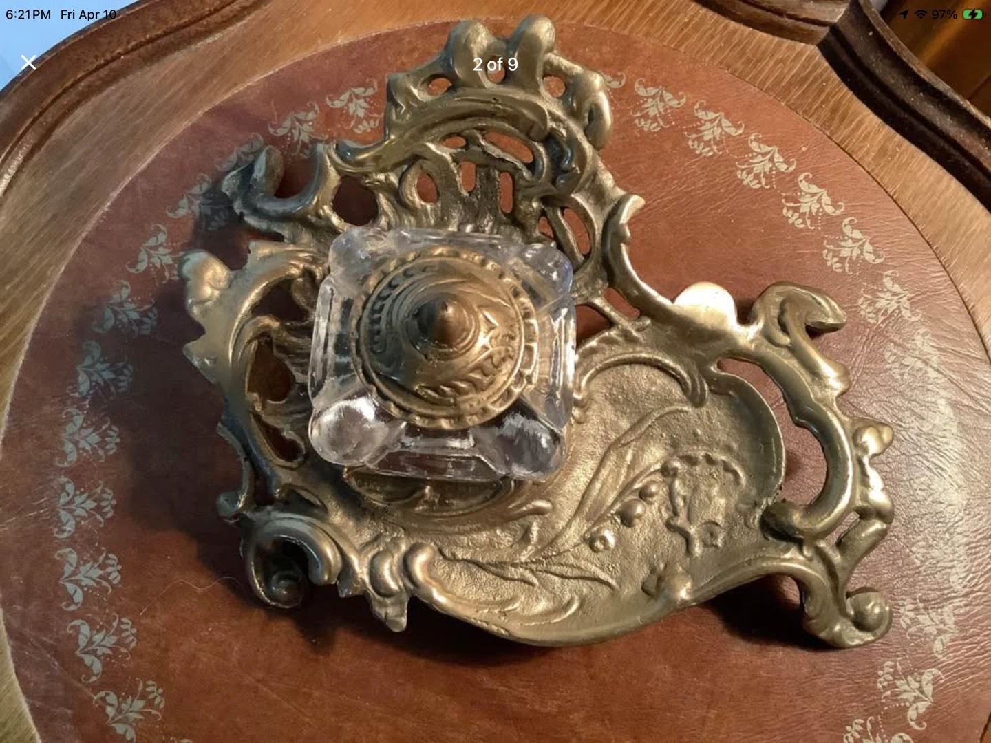 Vintage/Victorian style ornate brass and cut glass inkwell on a lily of the valley brass tray with scrolling feet.