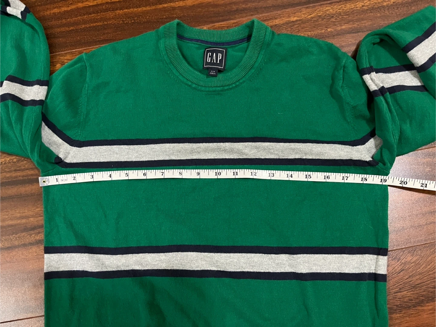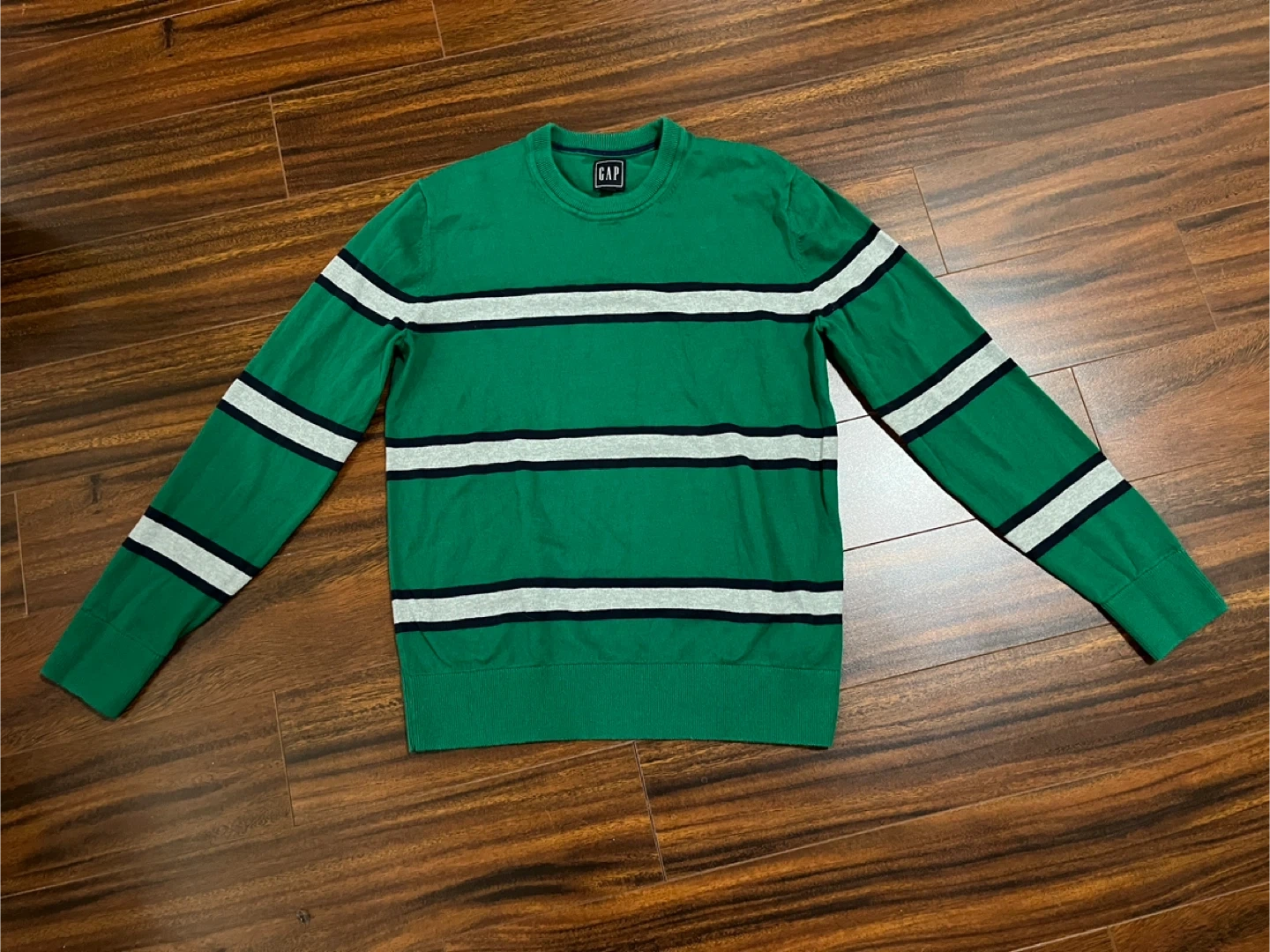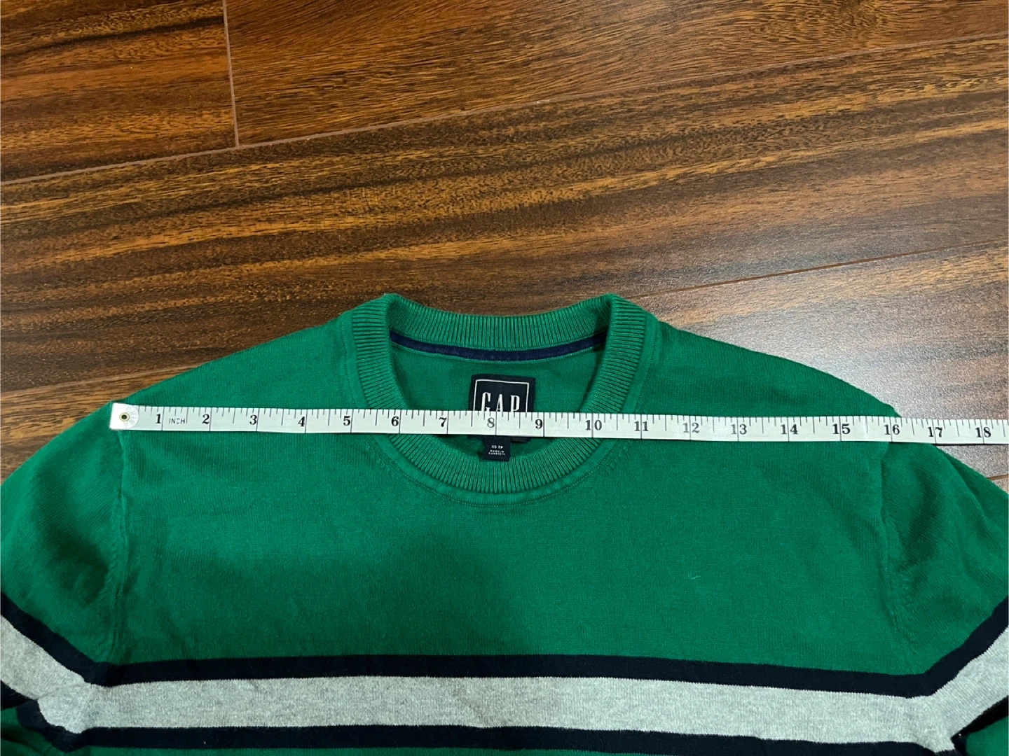 Men’s Gap Mainstay Crew sweater in green with white and navy horizontal stripes. 100% cotton with ribbed cuffs hem and collar. Excellent condition. Smoke-free home.